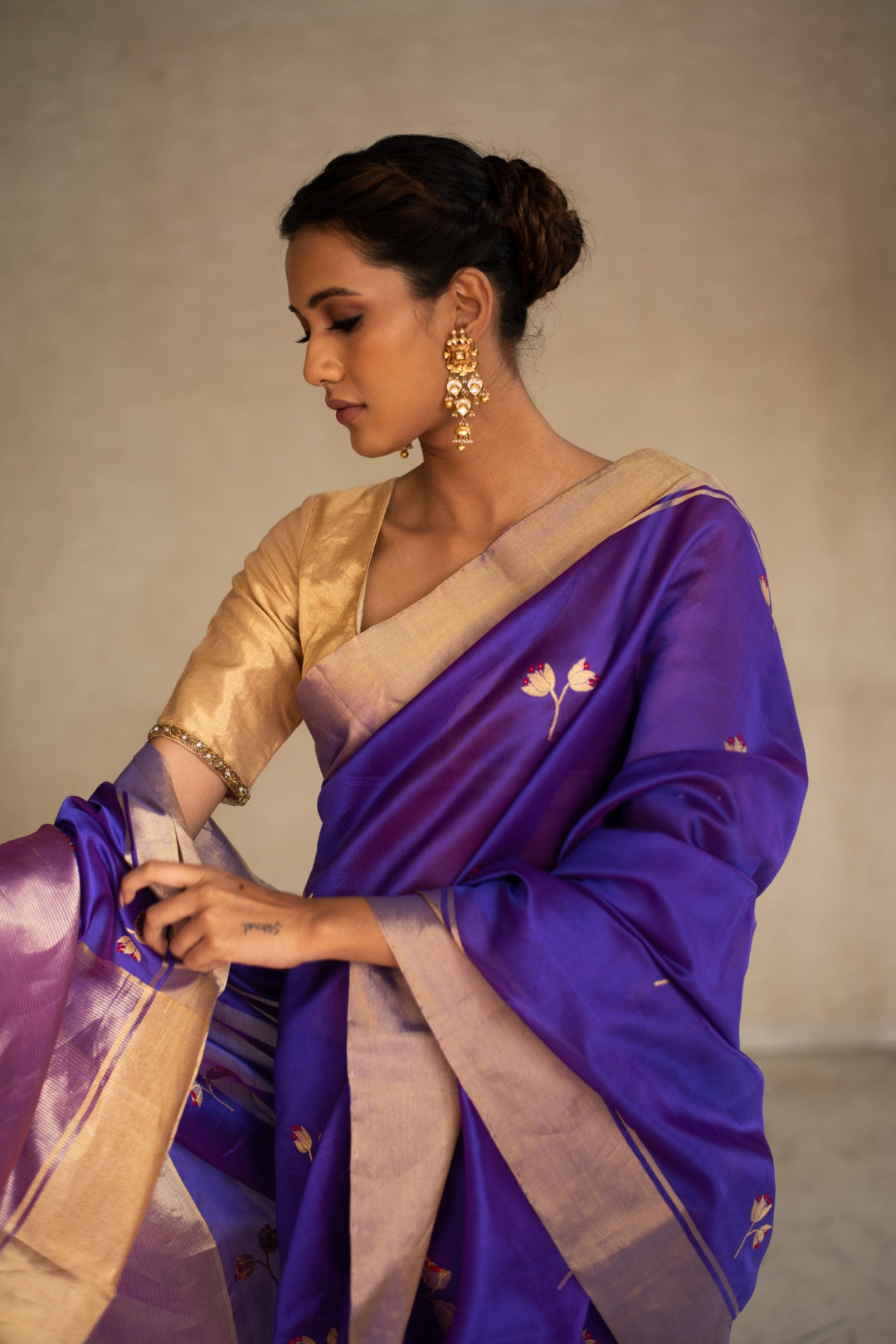 Purple silk chanderi saree with small floral butis featuring a gold border and palla.
