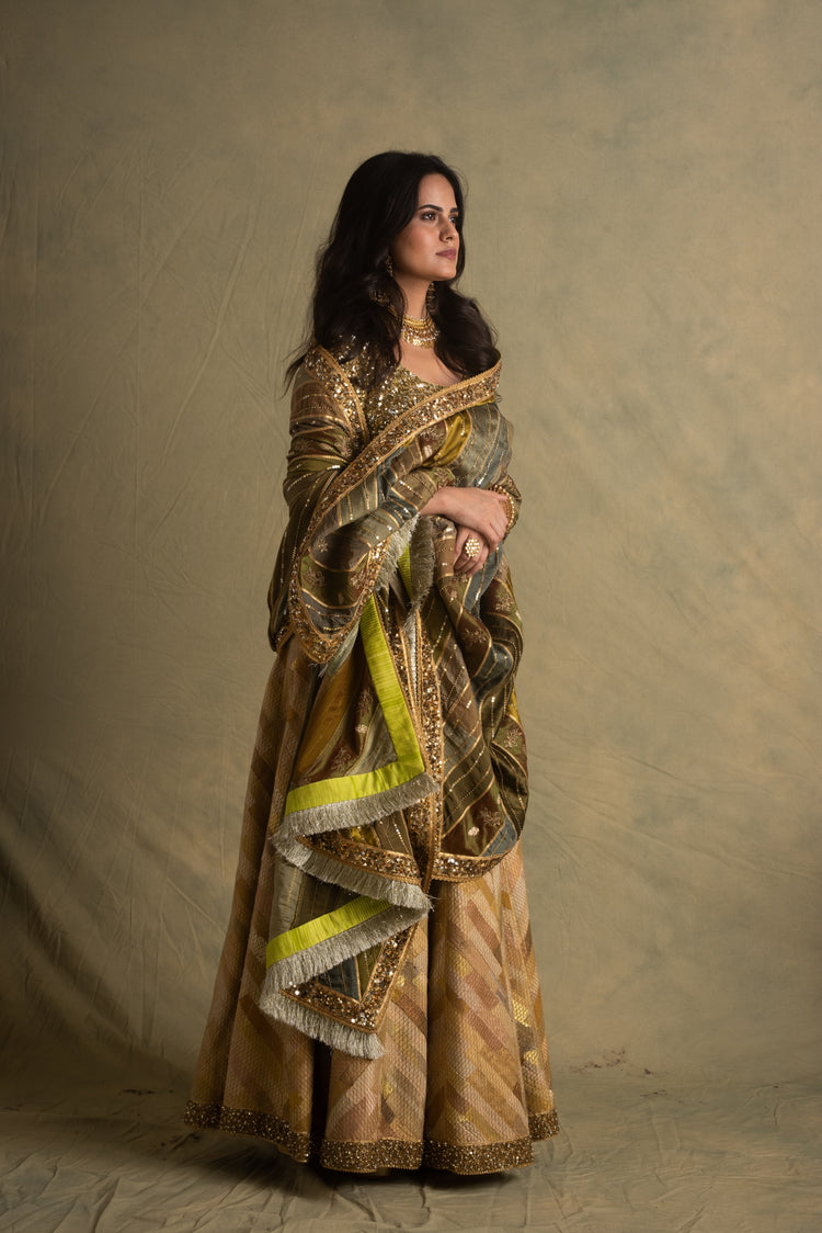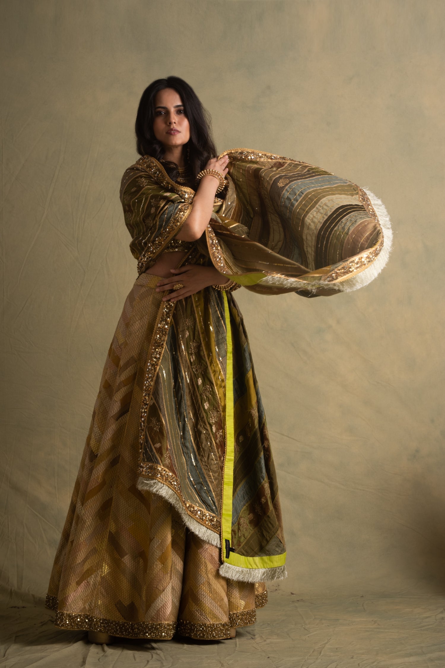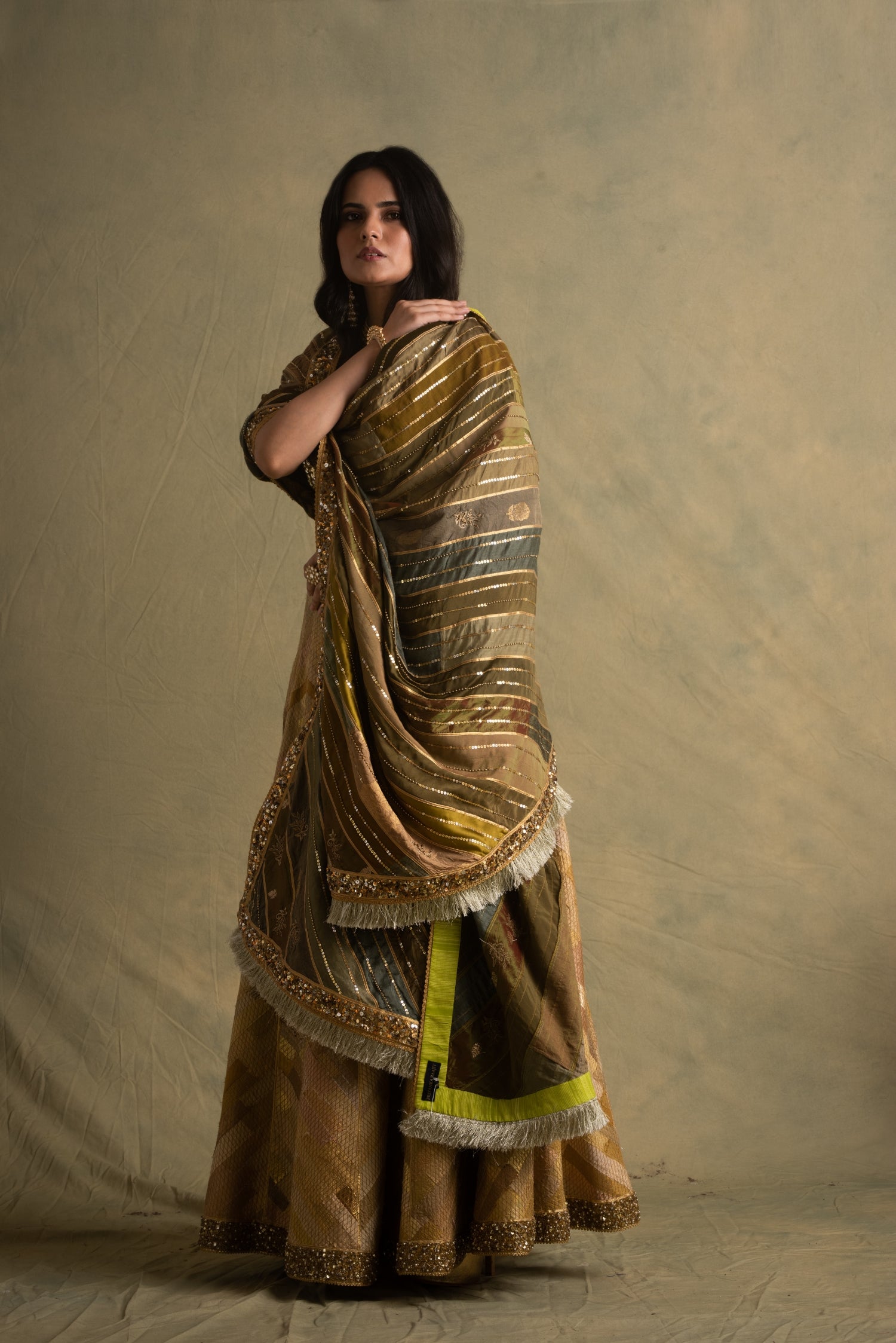 Upcycled patchwork dupatta made with the remnants of heritage fabrics and embroideries like chikankari, brocades, satins, silks, prints and hand weaves in shades of green .Each unit is further hand embroidered with zardozi and gota. The dupatta is bordered with handwoven silk and kiran.