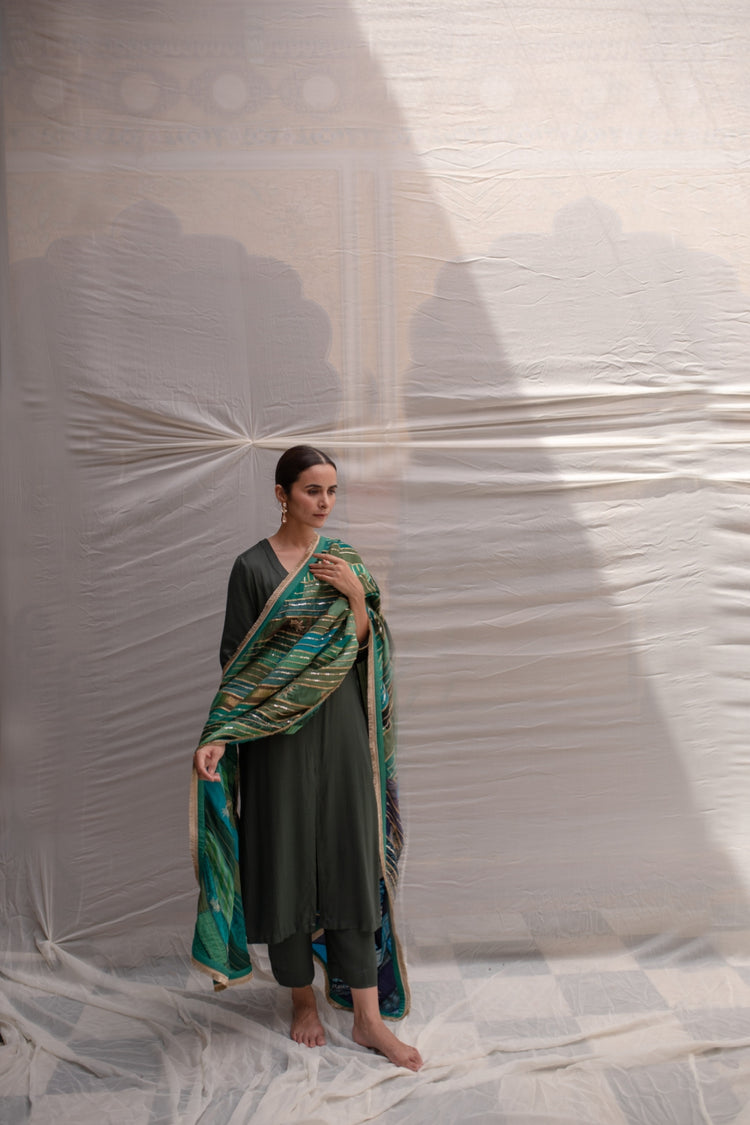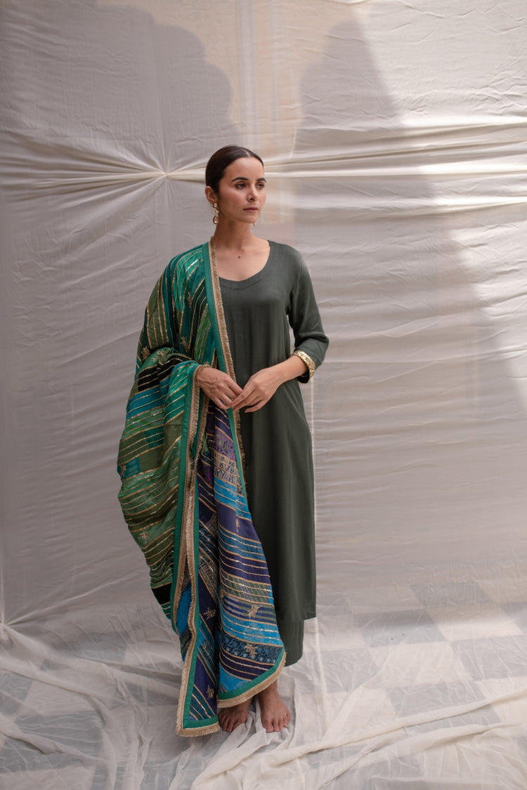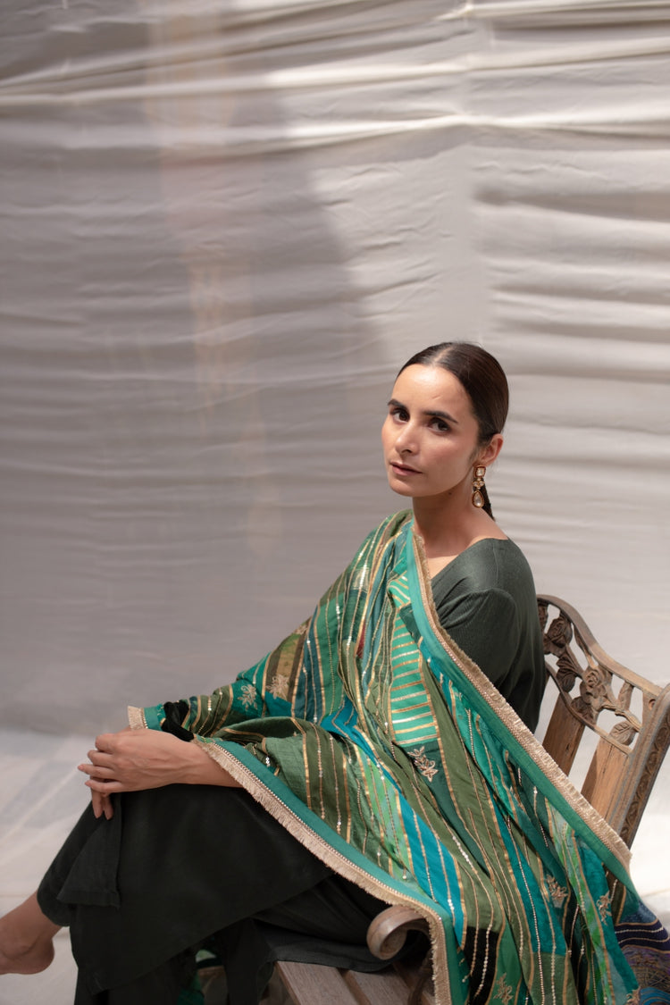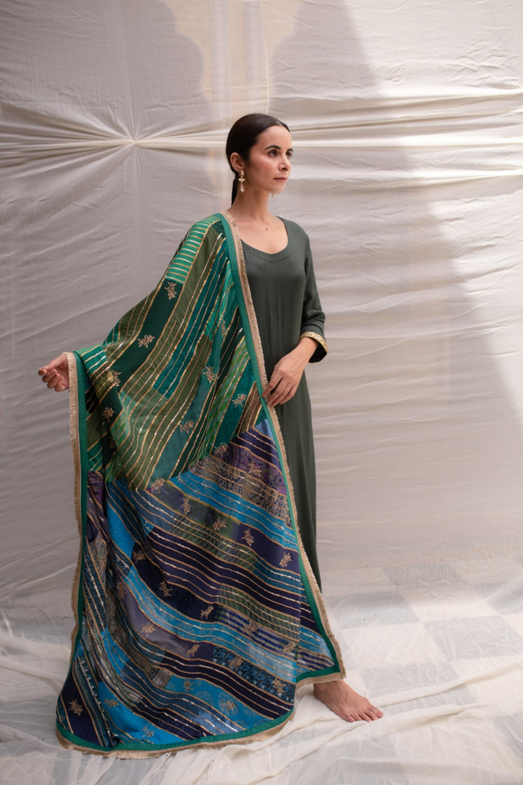 Upcycled patchwork dupatta made with the remnants of heritage fabrics and embroideries like chikankari, brocades, satins, silks, prints and hand weaves in shades of green and blue . Each unit is further hand embroidered with zardozi and gota. The dupatta is bordered with handwoven silk.