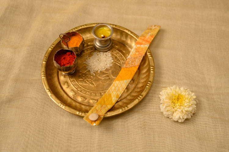 Upcycled patchwork Rakhis made from textile remnants in shades of Yellow. It features a button and eye closure, allowing for easy size adjustment and ensuring a comfortable fit for any wrist.