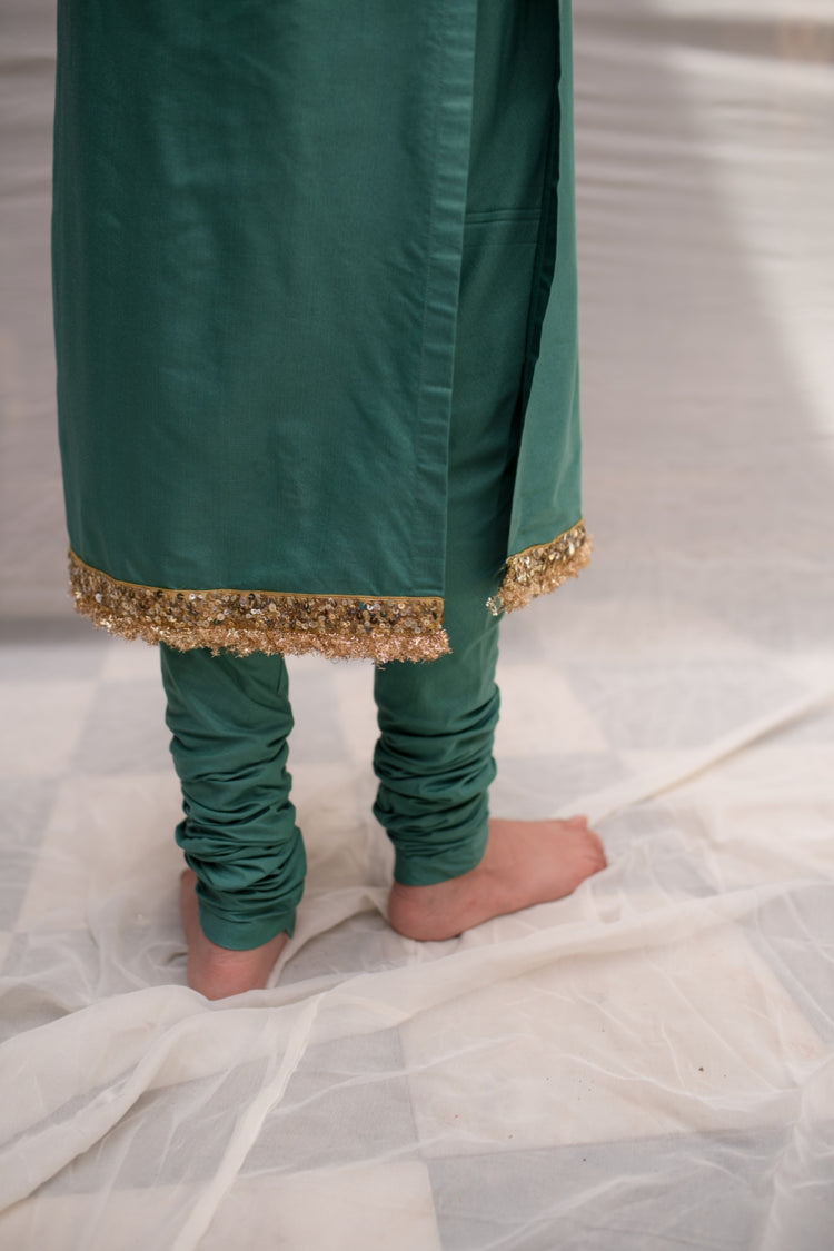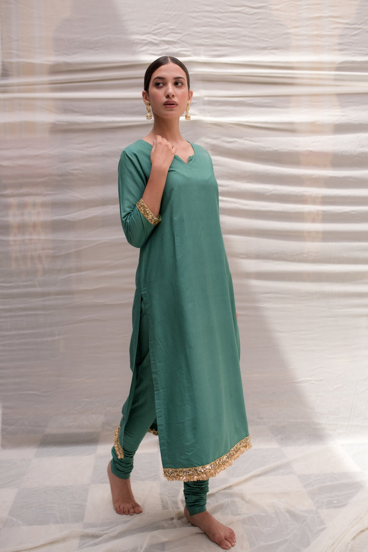 Teal cotton silk straight kurta set with hand embroidered sequin zardozi trim on sleeves and hem. The kurta is paired with tulle makishe dupatta finished with kiran and churidaar.
