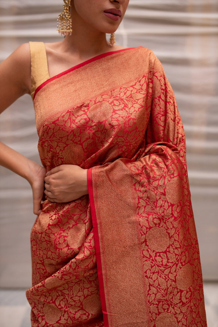 Red silk brocade banarasi sari with all over floral jaal with borders and palla in molten antique gold.