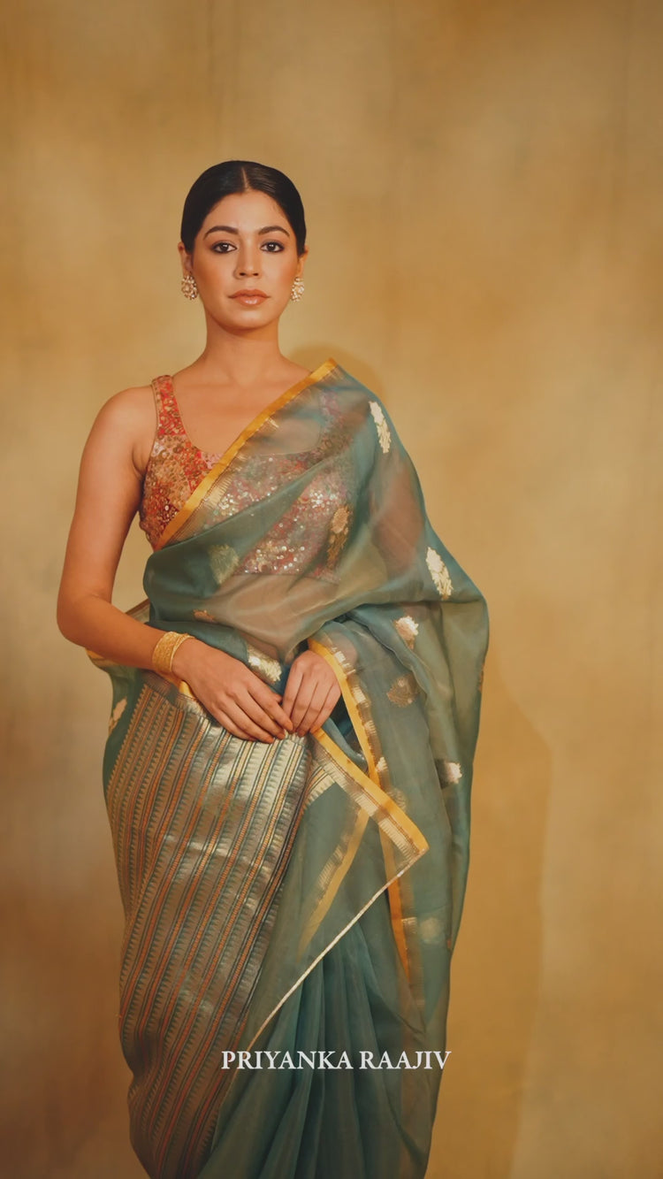 Teal silk organza banarasi saree with light and vintage gold paisley buti along with thin gold border and palla