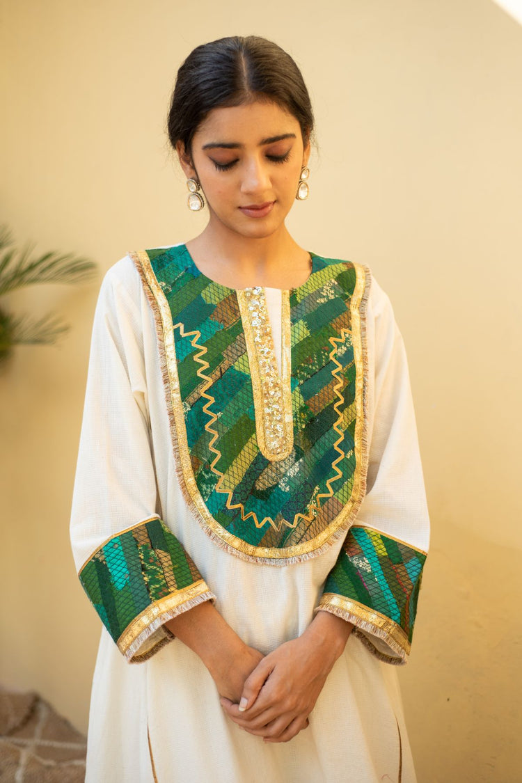 Ivory organic cotton kurta and pants with upcycled patch work yoke and sleeves in shades of deep green. The patchwork is made with the remnants of heritage fabrics like brocades,satins,Silk s,prints,cottons and hand weaves and is further emphasized with handcrafted sequins, zardozi ,gota,lampi and kiran.