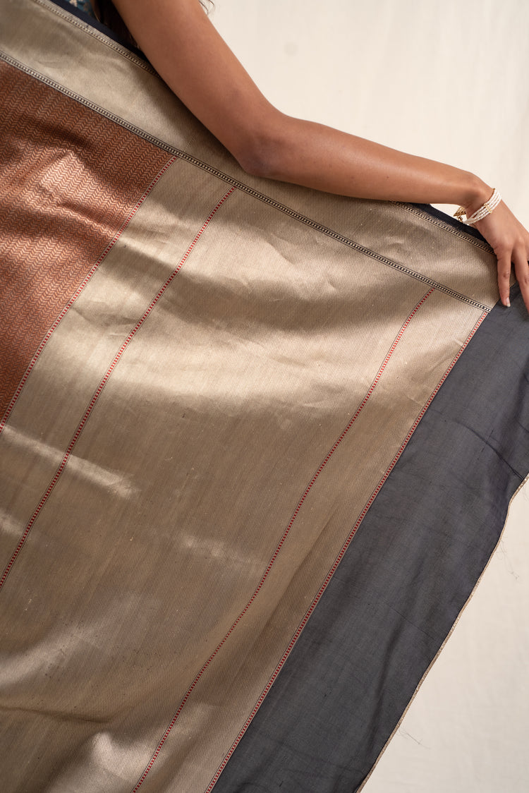 Copper textured silk banarasi saree with silver zari minakari border