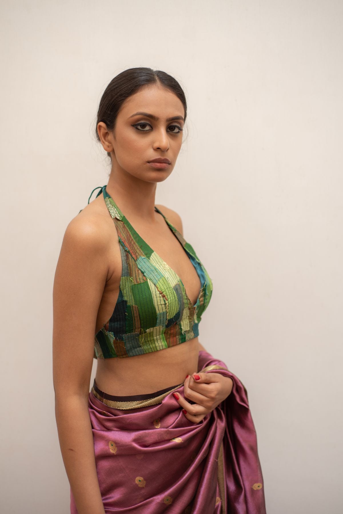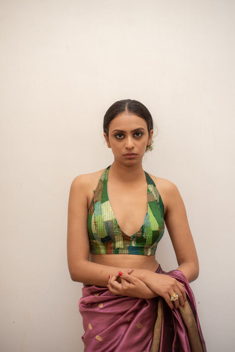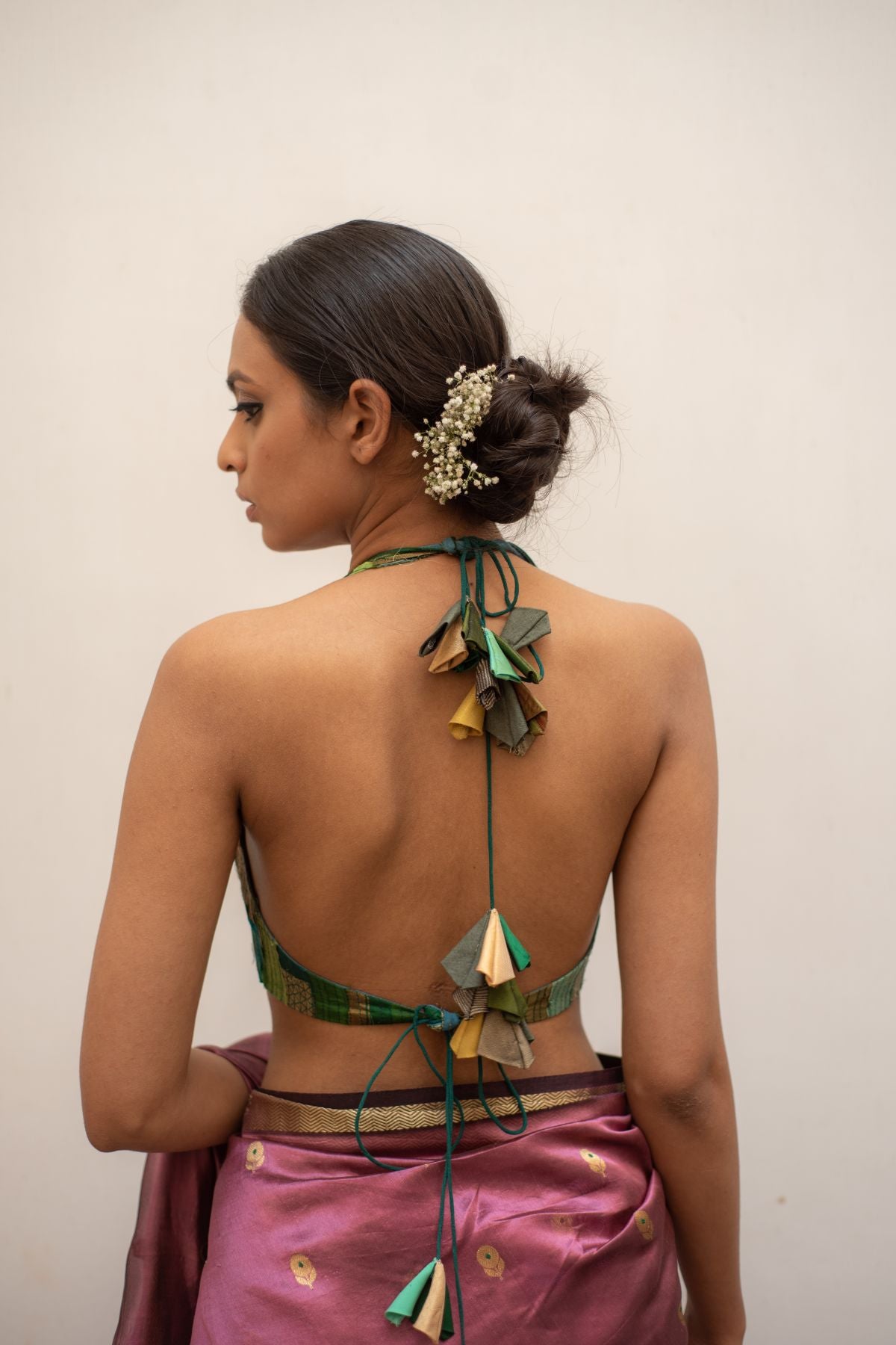Upcycled halter patchwork blouse in shades of green with heavy tassels