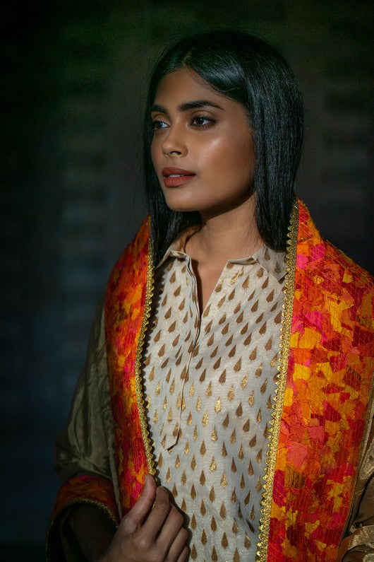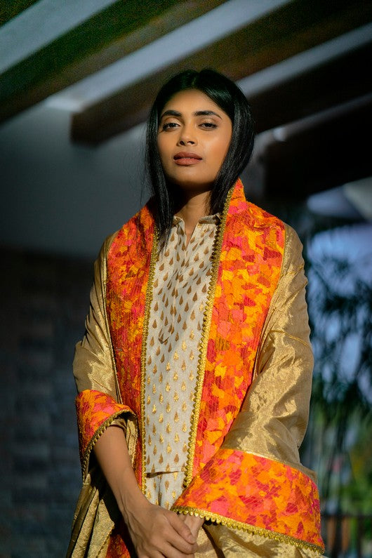 Ivory and gold chanderi silk brocade tissue lehanga and kurti paired with gold tissue dupatta made with upcycled patchwork border in shades of coral and red with gota highlighting.