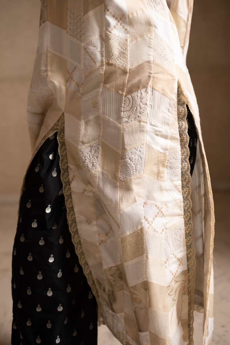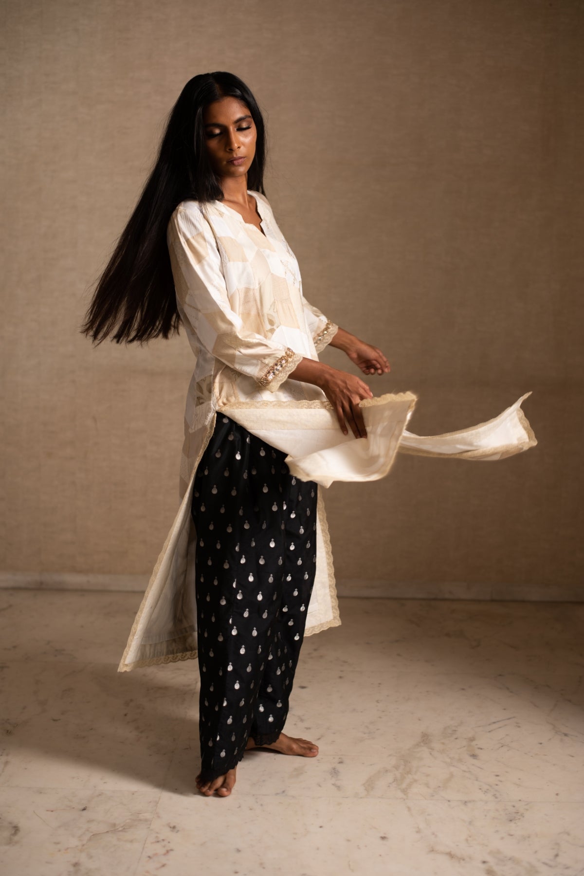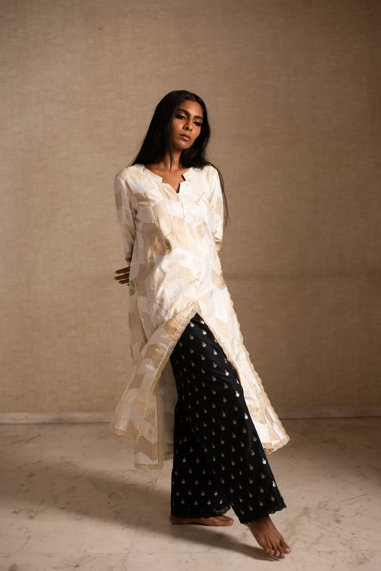 Upcycled patchwork kurta in shades of ivory and beige made with remnants of heritage fabrics like silks,cottons, prints, brocades and handwoven tissues.The kurta is paired with Anaya ,our black silk chanderi brocade palazzos and Aabha, our gold tissue dupatta with sequins.
