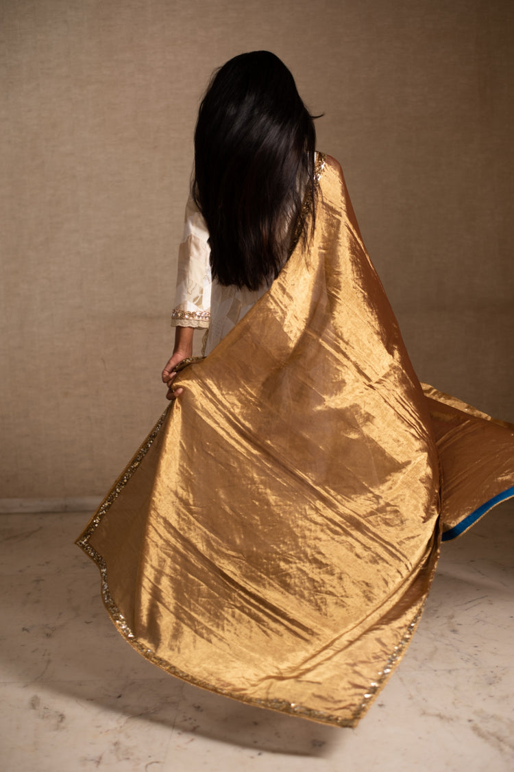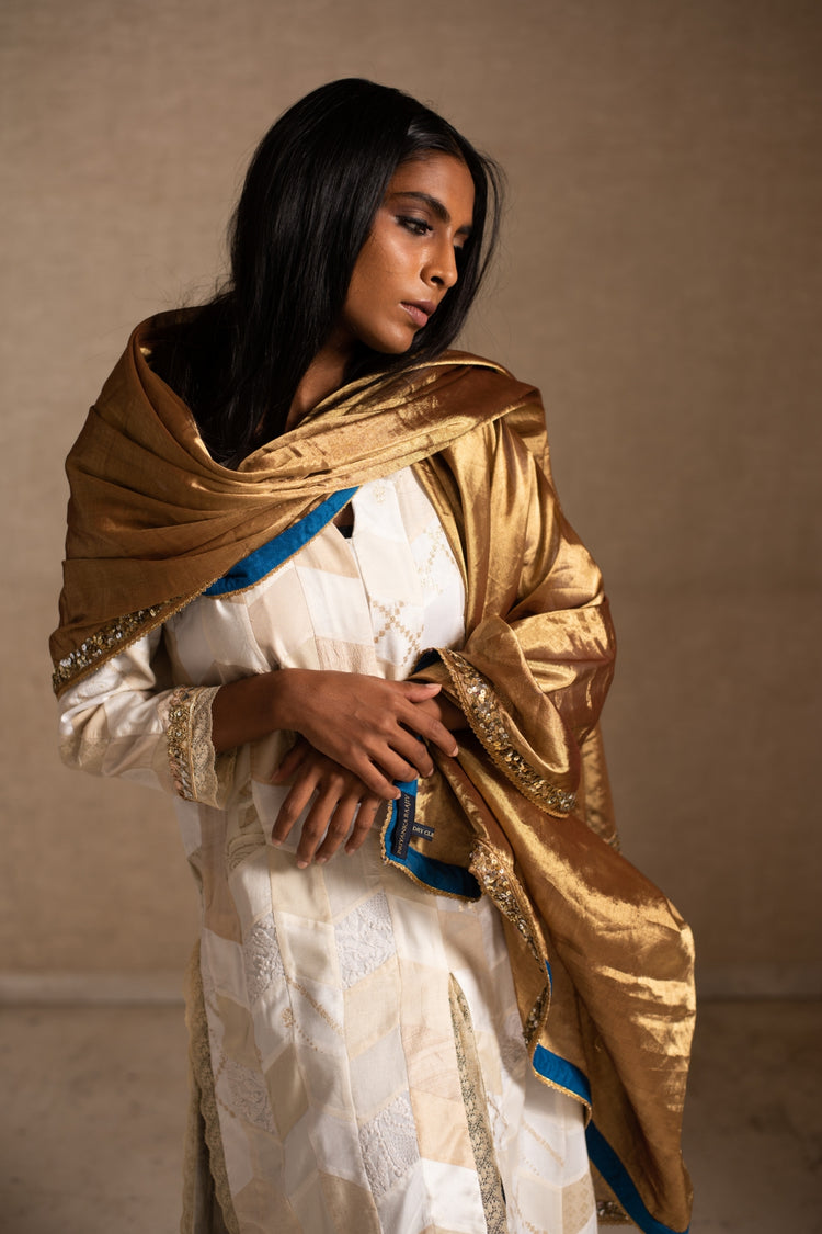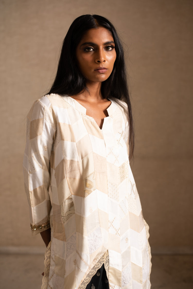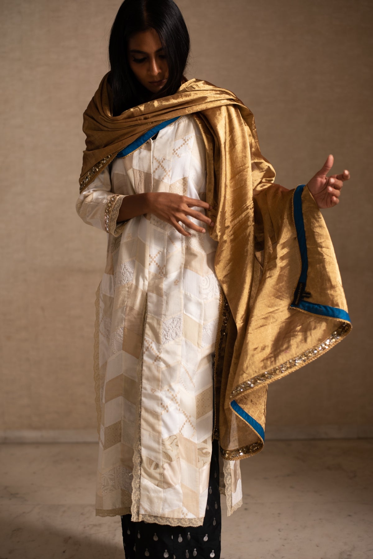 Upcycled patchwork kurta in shades of ivory and beige made with remnants of heritage fabrics like silks,cottons, prints, brocades and handwoven tissues.The kurta is paired with Anaya ,our black silk chanderi brocade palazzos and Aabha, our gold tissue dupatta with sequins.