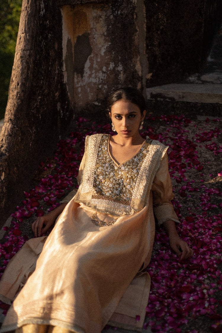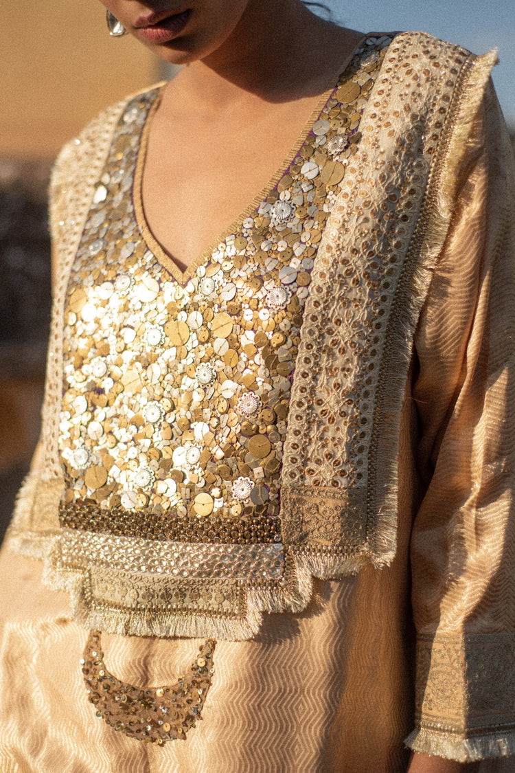 Beige Silk brocade kurta with upcycled patchwork yoke made with coin work, remnants of hand embroidered zardozi borders and kiran. The kurta is paired with Nara, sand yellow Silk brocade palazzo.
