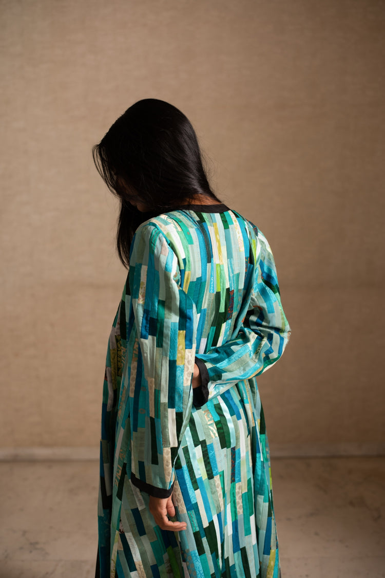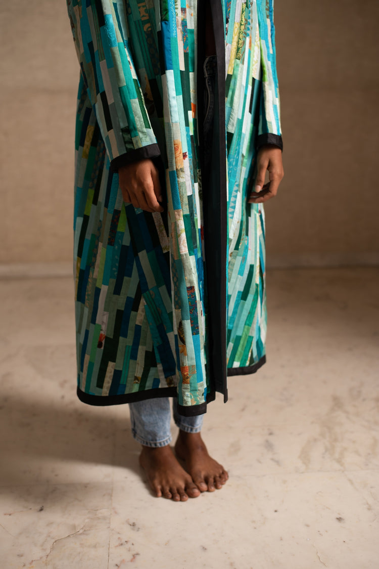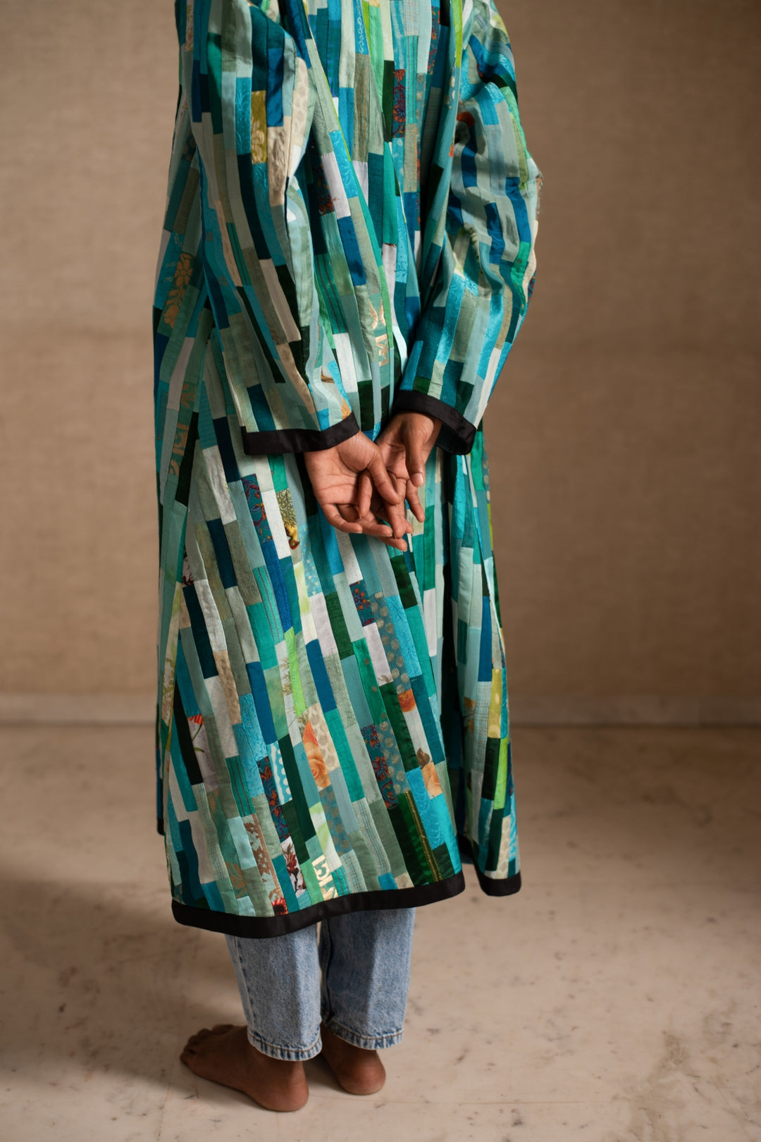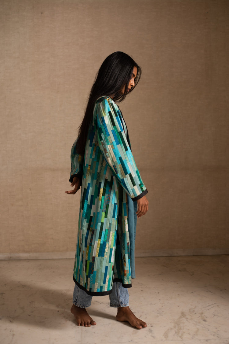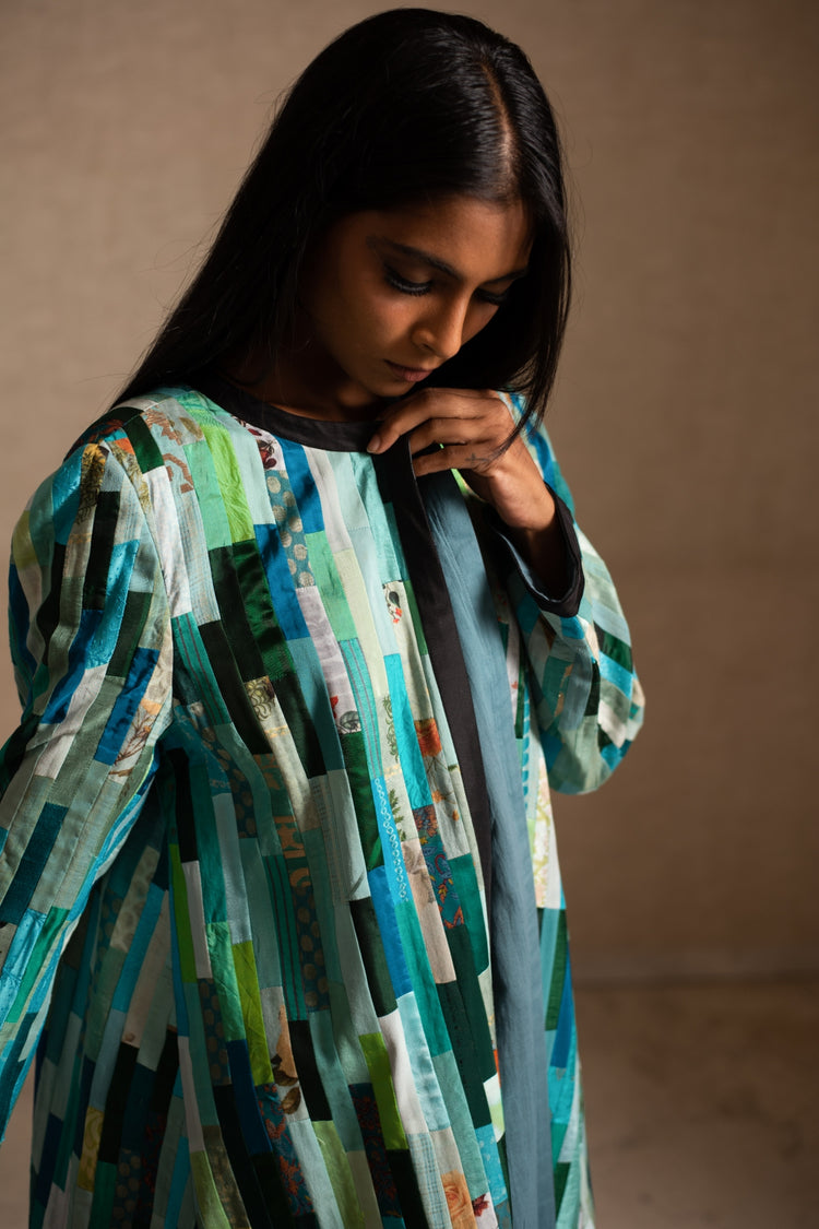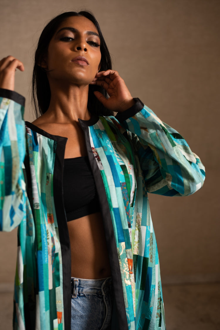 Upcycled patchwork jacket in shades of teal made with remnants of heritage fabrics like silks, brocades, handwoven tissues, prints and embroideries.