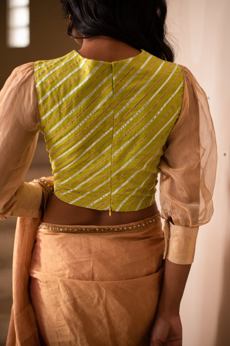 Upcycled patchwork blouse with gota leher and gold puffed sleeves.