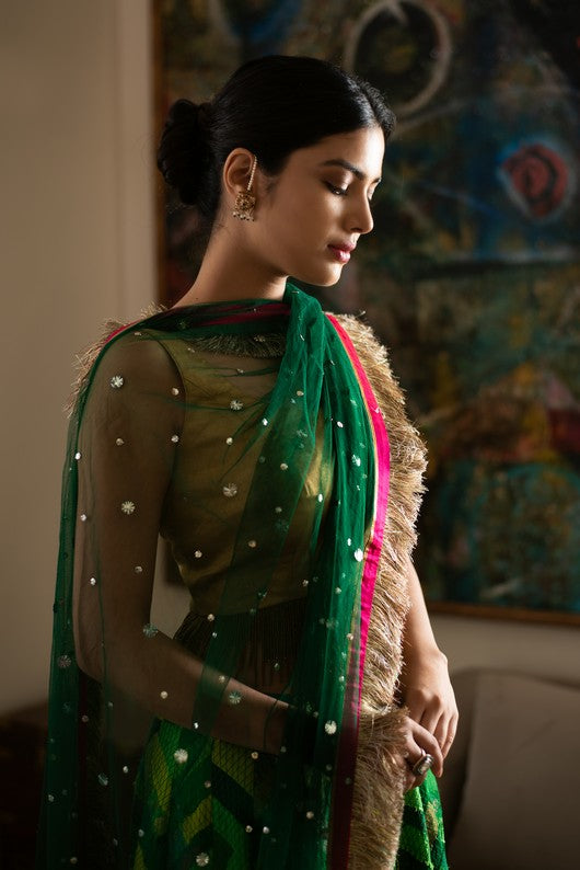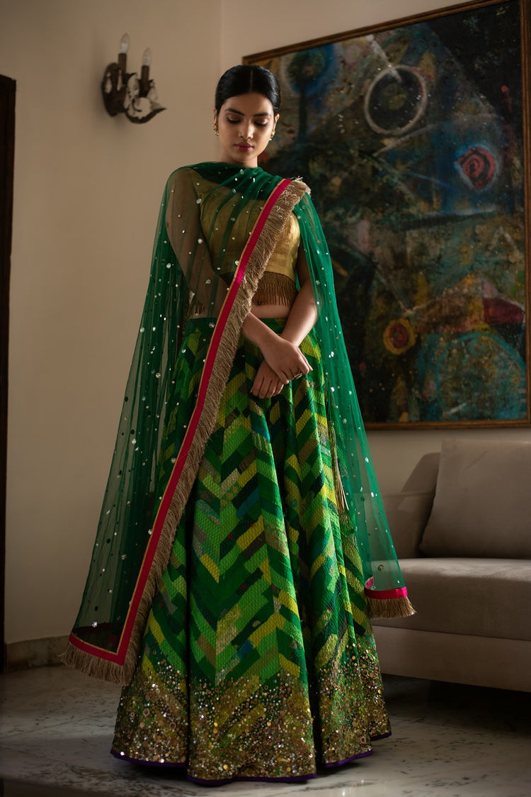Upcycled patchwork lehenga in shades of green with hand embroidered sequin clusters paired with vintage gold tissue blouse and tulle dupatta with makaish and kiran