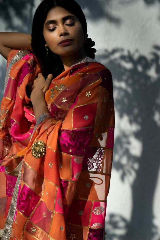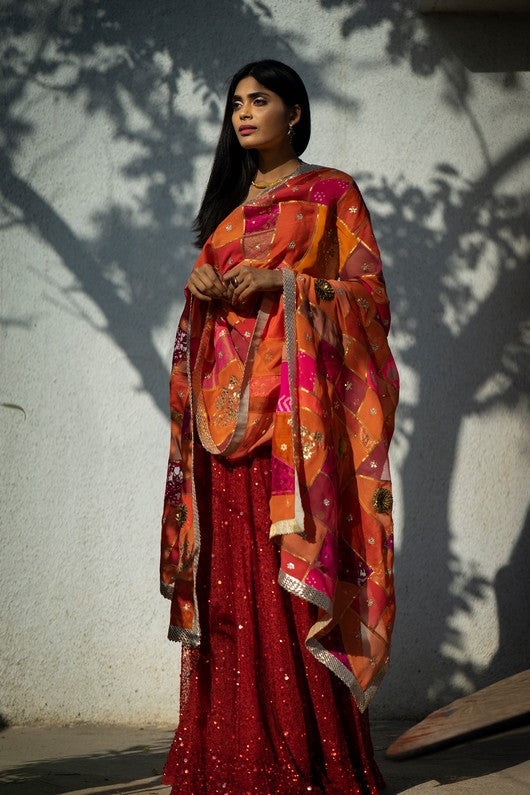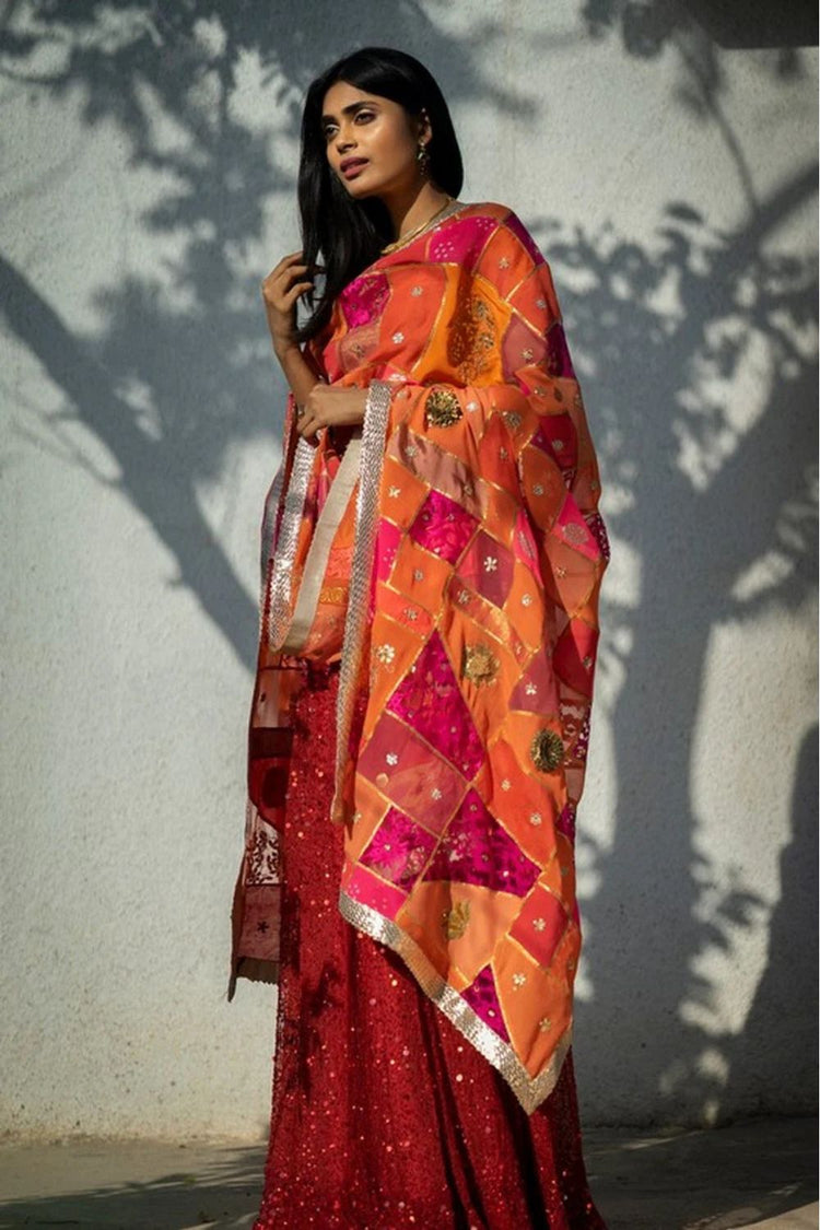 Red hand embroidered sequinned lehenga and gold tissue blouse paired with upcycled patchwork dupatta in shades of red, corals and pink embroidered with gota and zardozi.