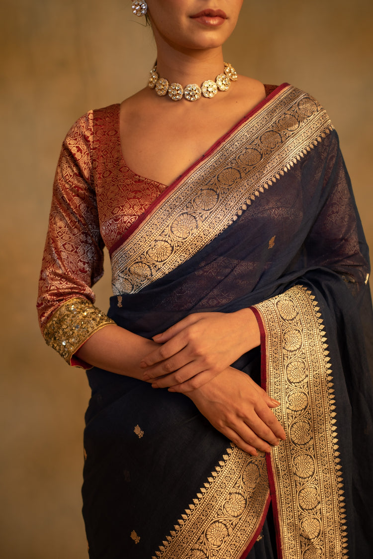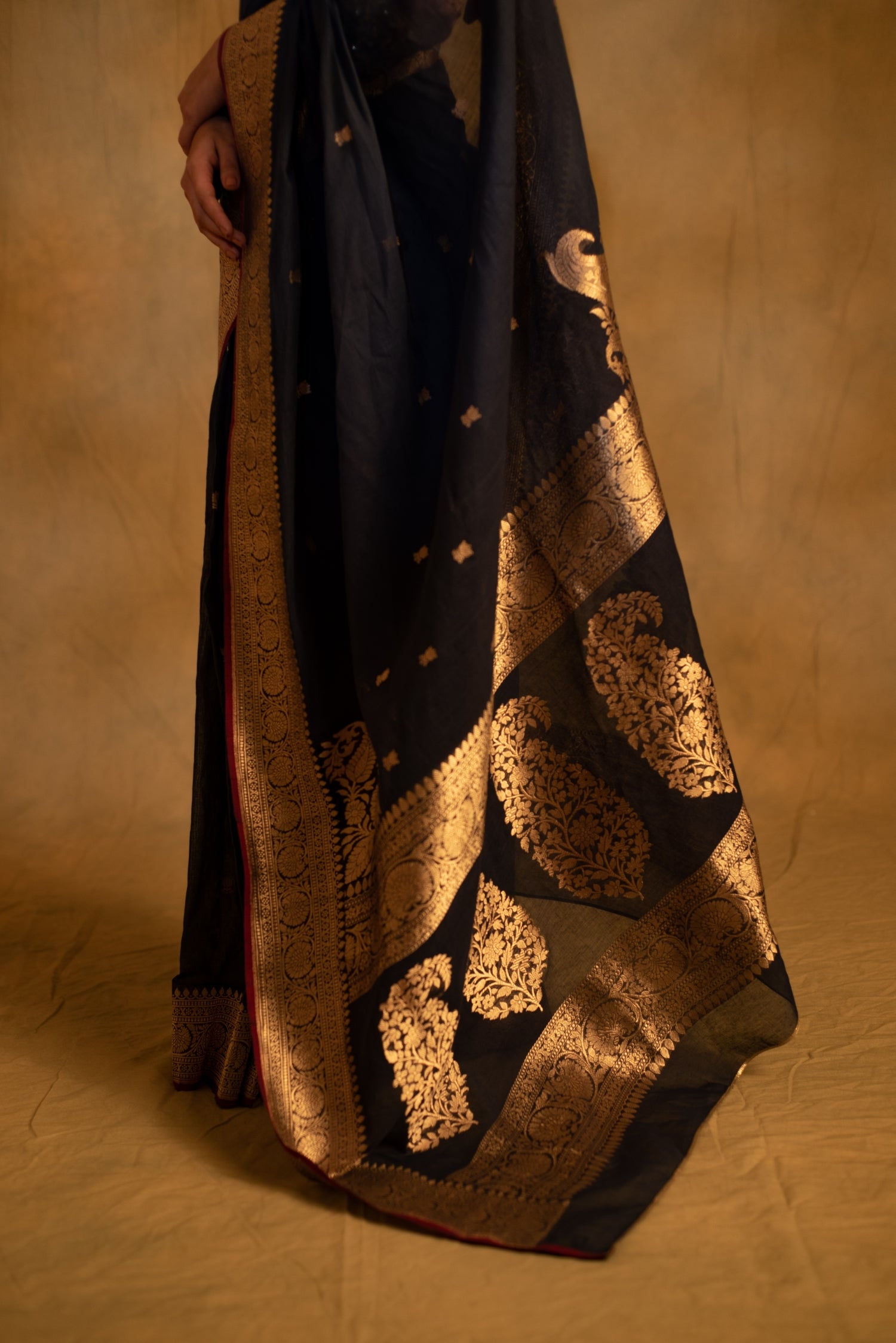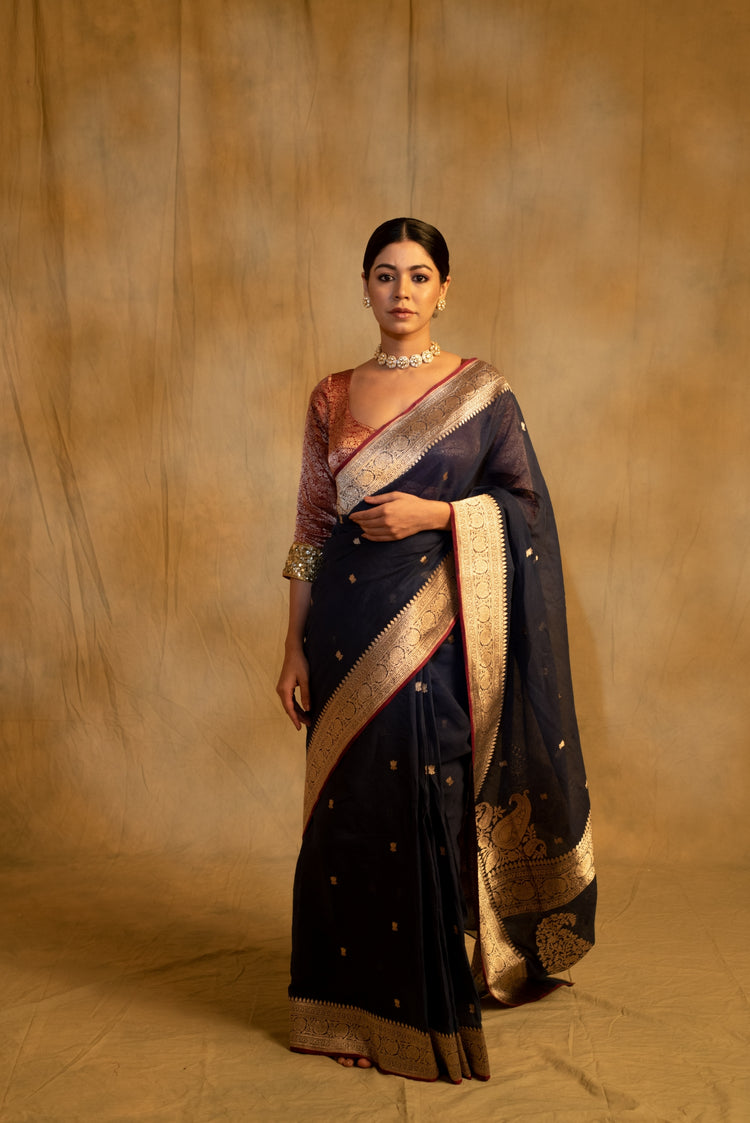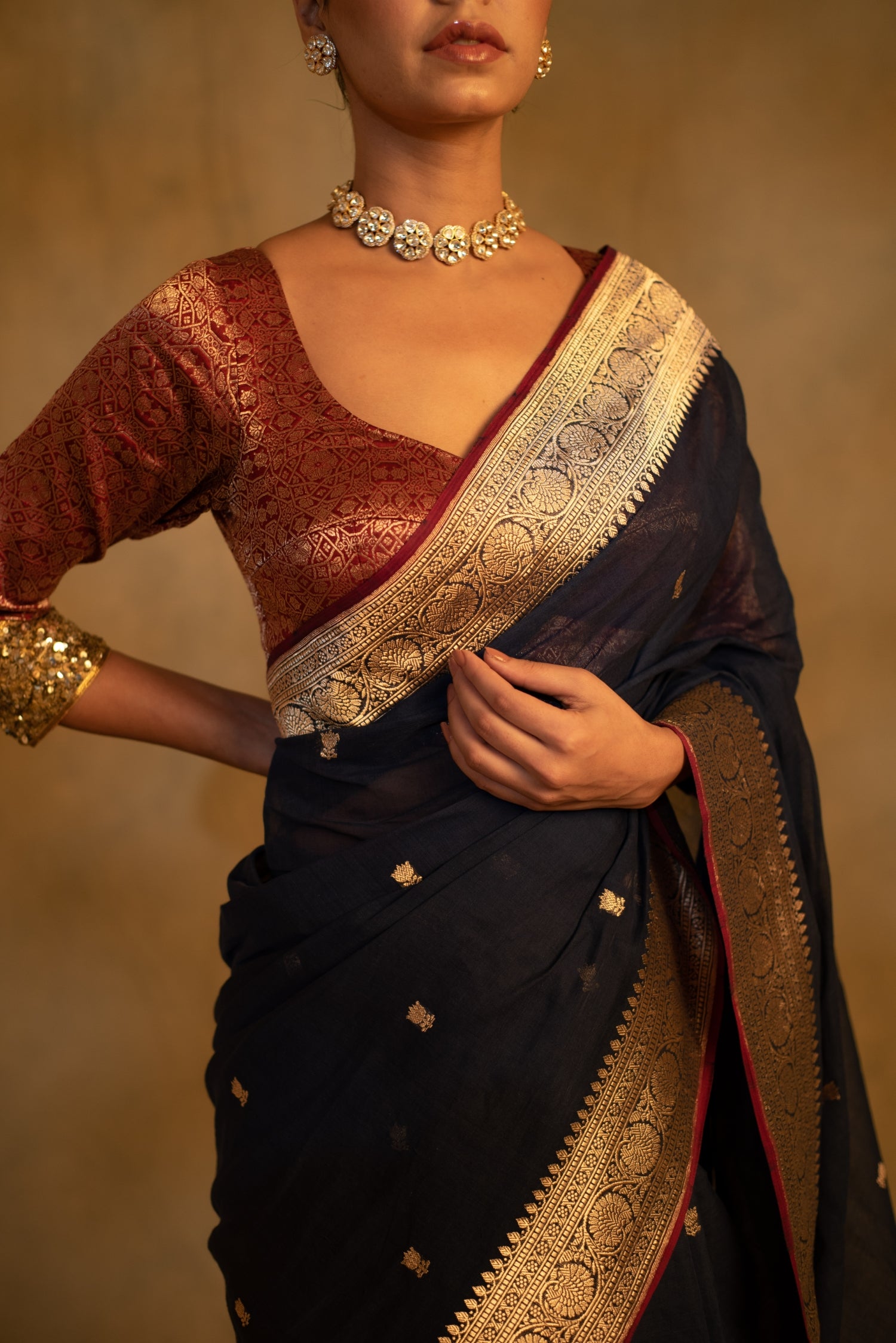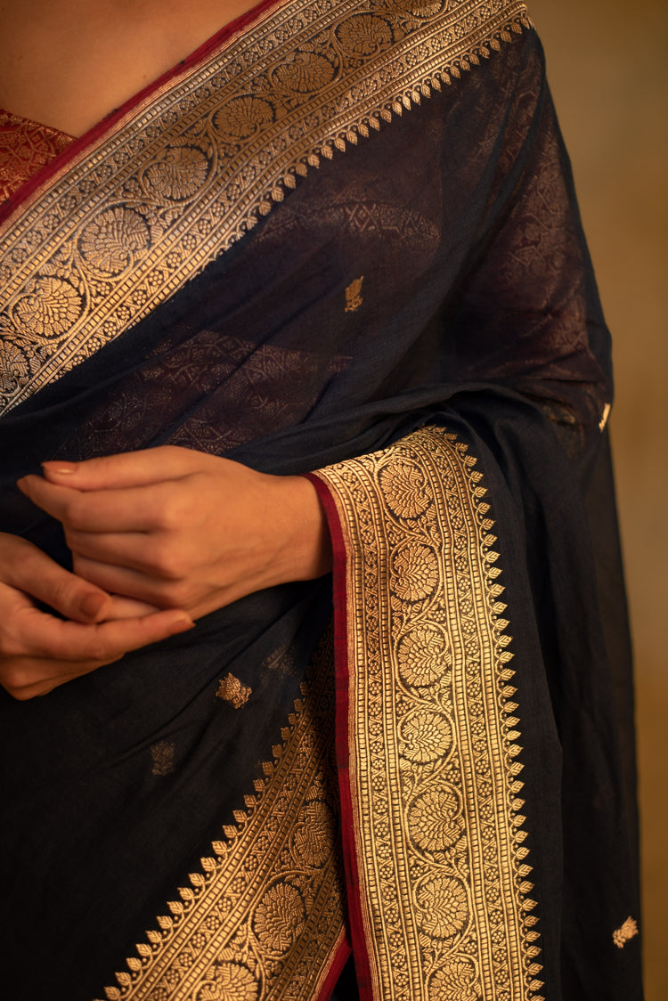 Navy blue cotton handcrafted banarasi brocade saree with small floral buti and detailed gold border and palla. The saree features kuniya buti