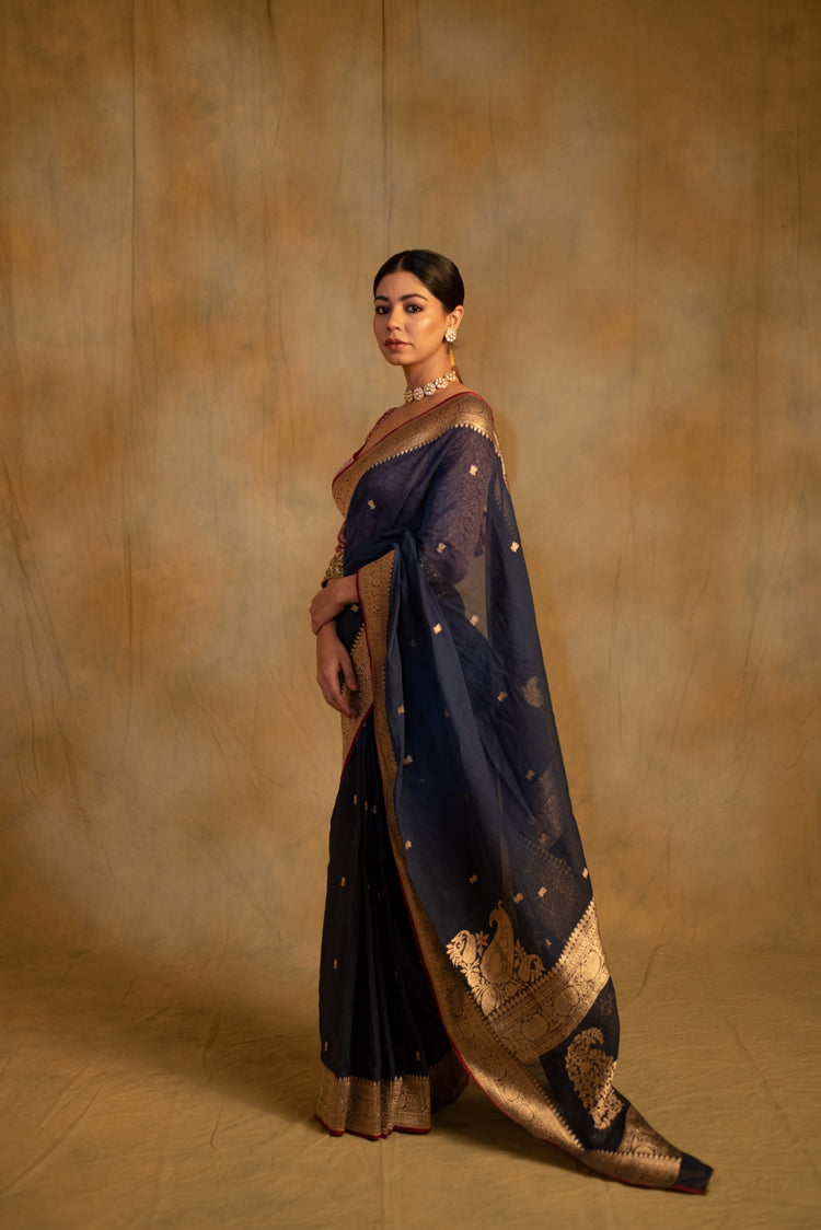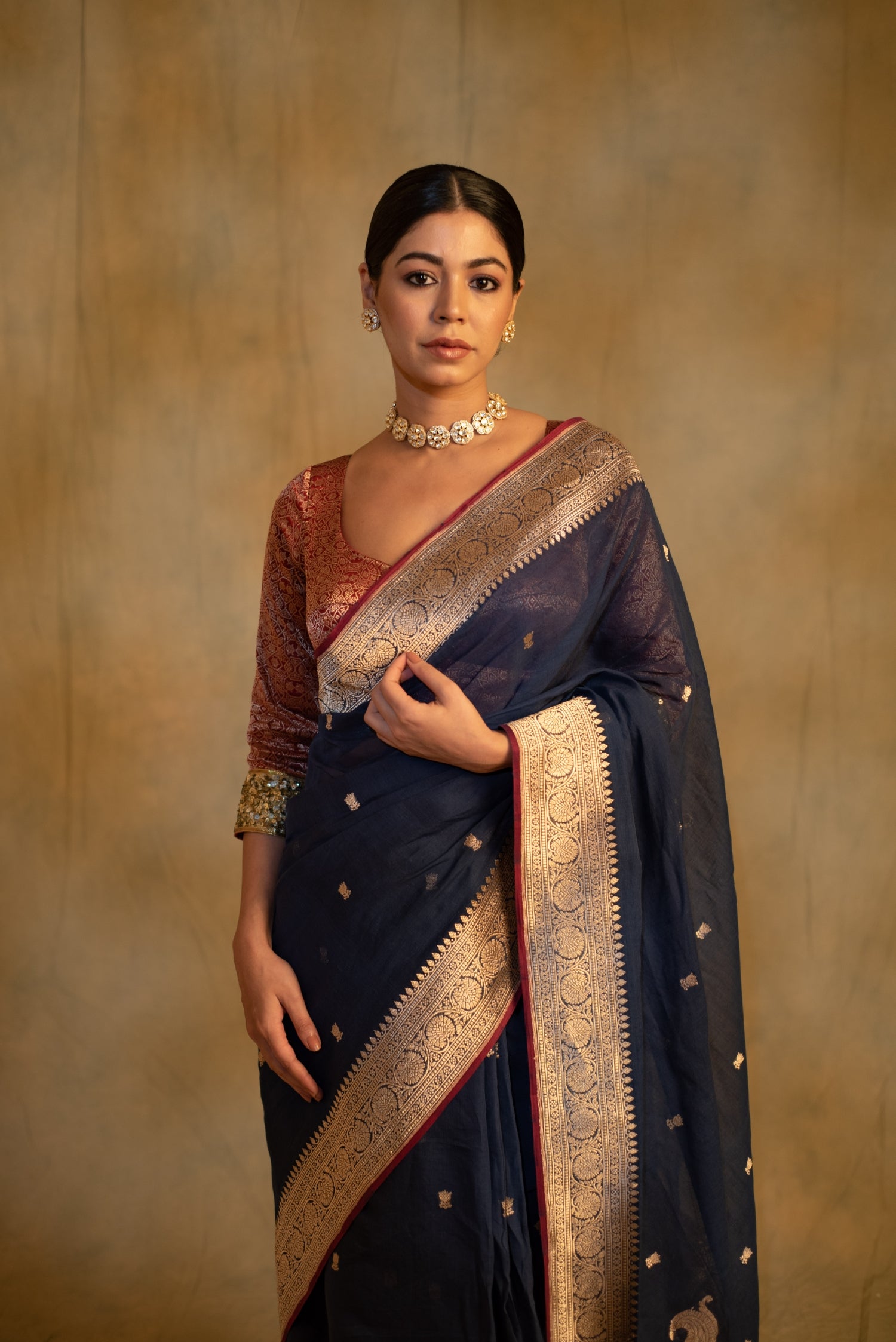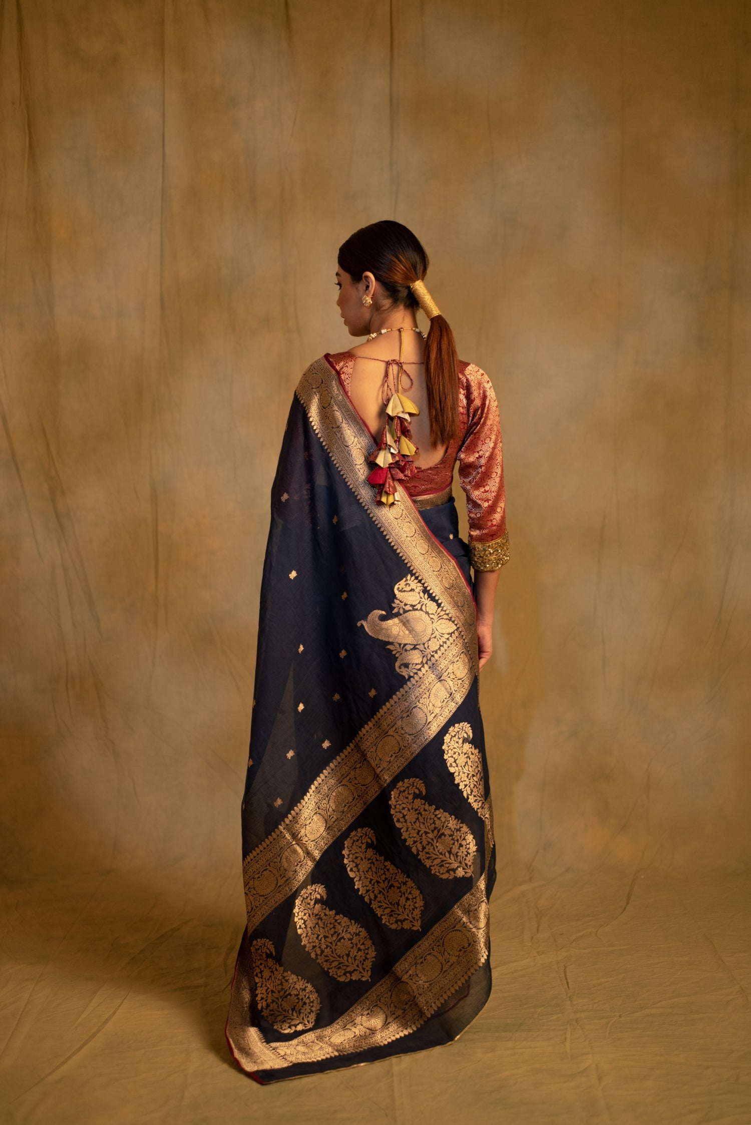 Sankranti- Navy Blue Cotton Banarasi Saree