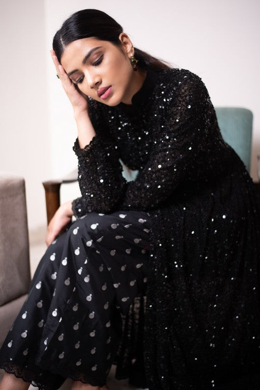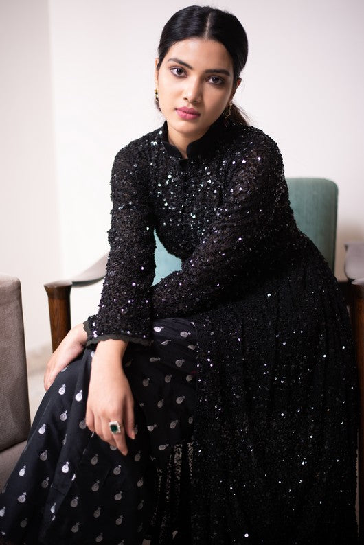 Black hand embroidered sequin jacket paired with silk brocade trousers