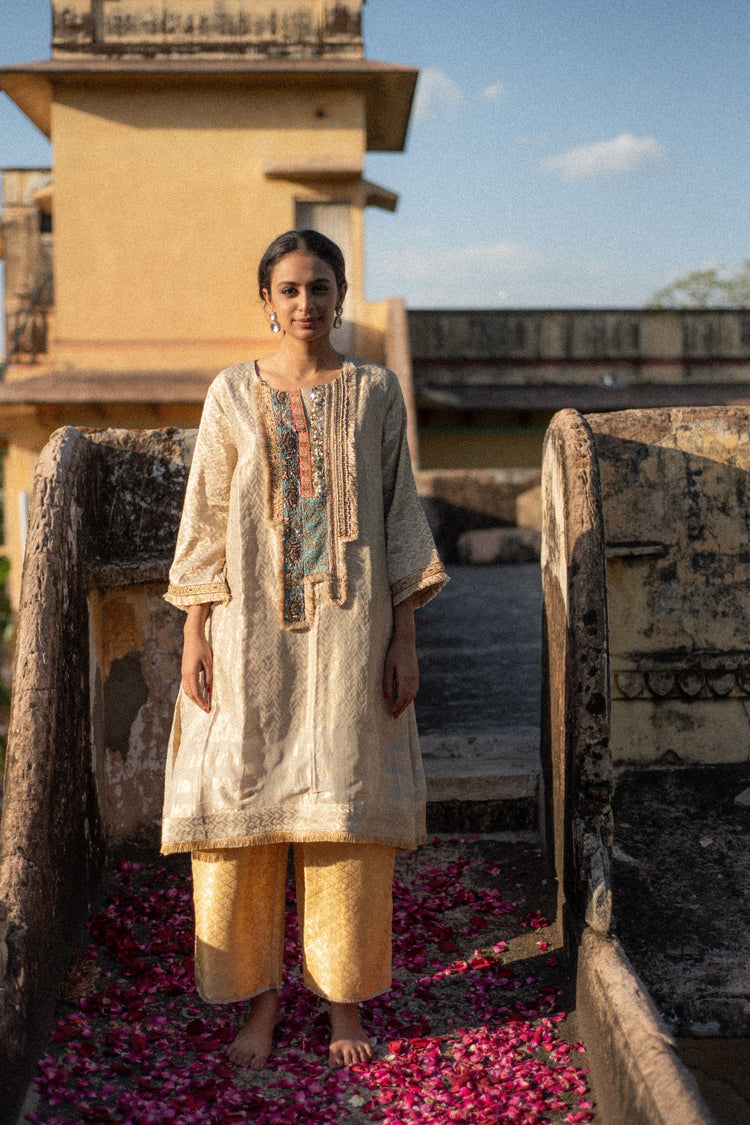 Ivory Silk brocade kurta with upcycled patchwork yoke made with remnants of hand embroiered zardozi borders and kiran. The kurta is paired with Nara, sand yellow brocade palazzo.