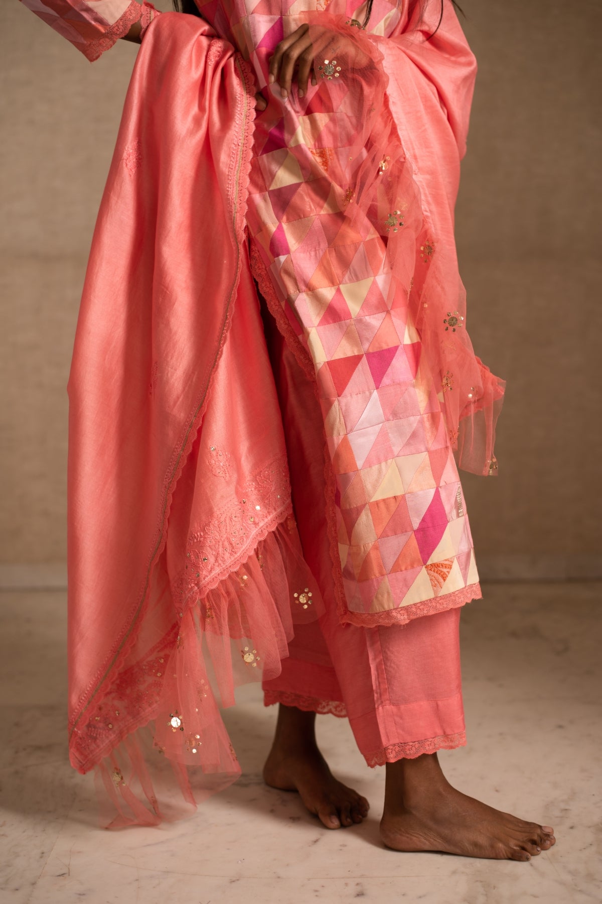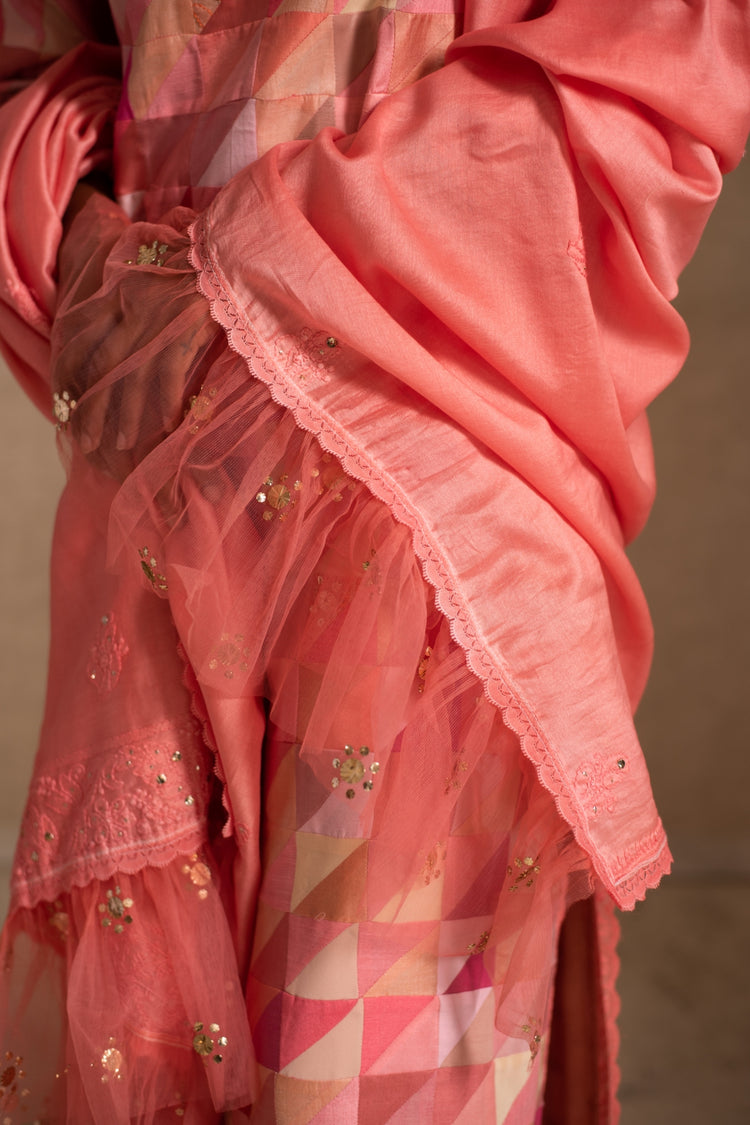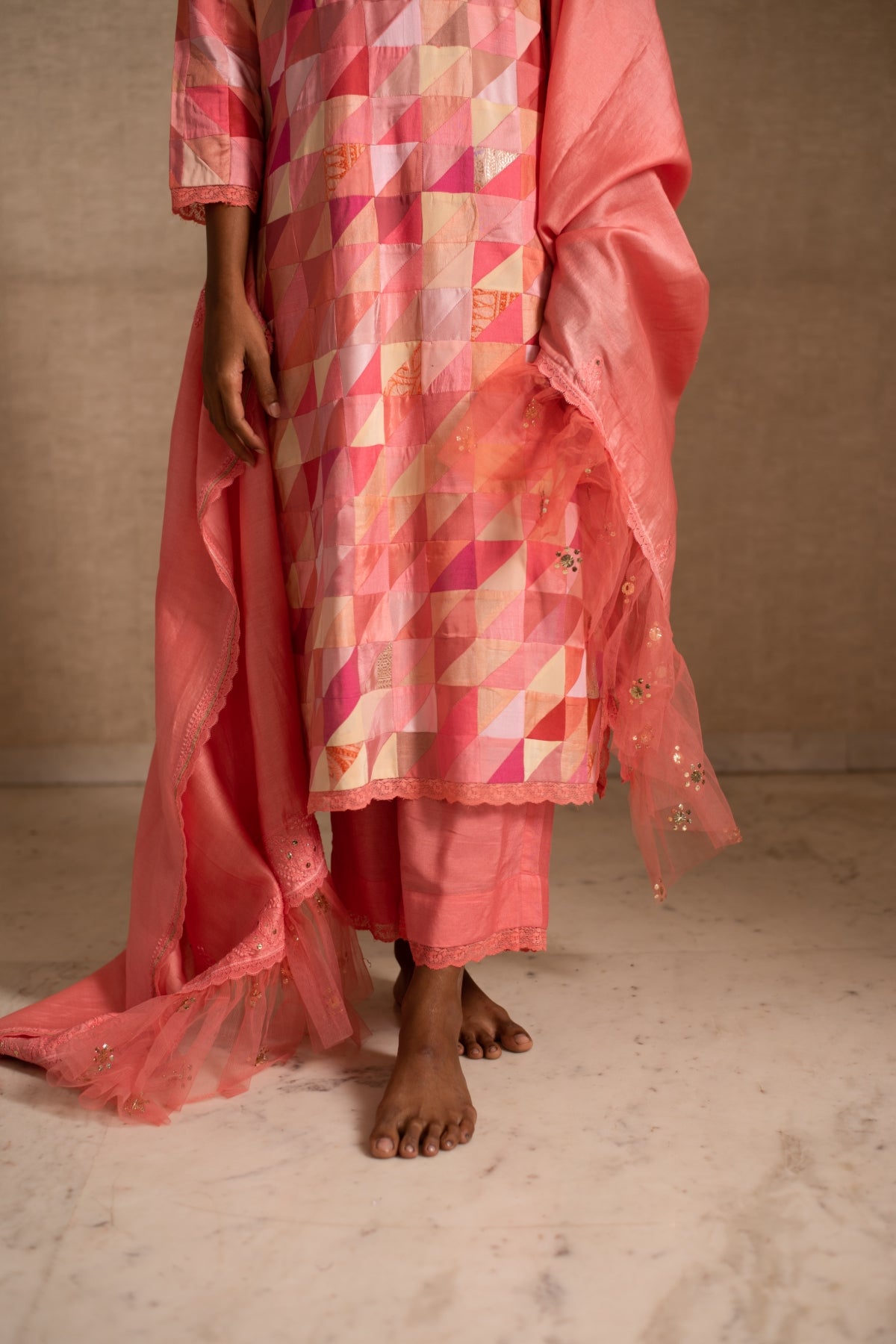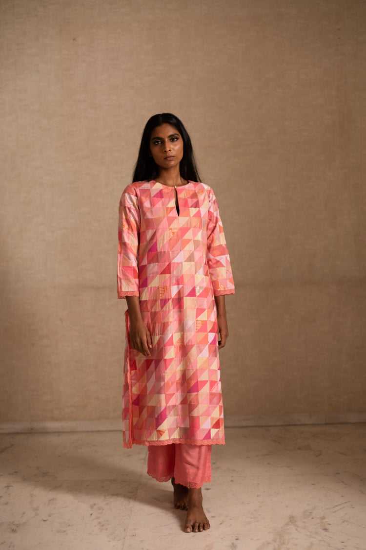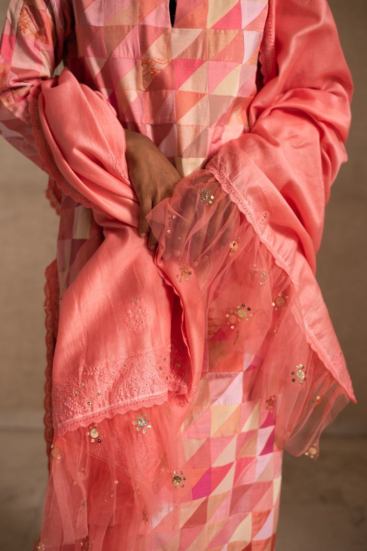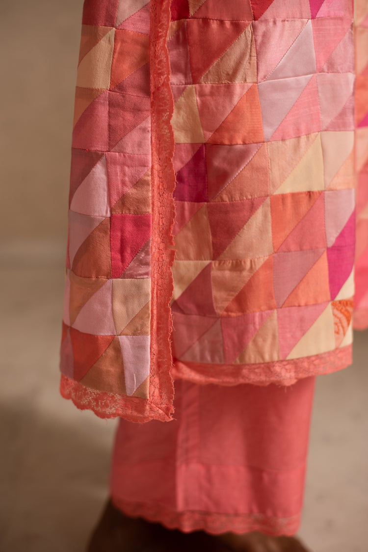 Upcycled patchwork kurta in shades of salmon pink made with remnants of heritage fabrics like silks, brocades, prints and handwoven tissues.The kurta is paired with a chikankari chanderi silk dupatta and palazzos.