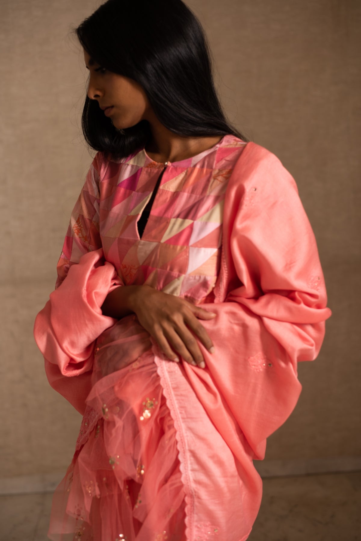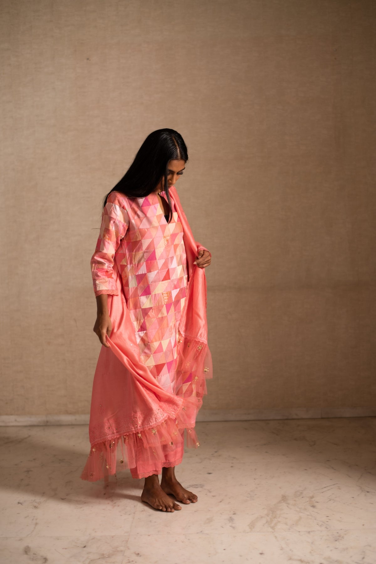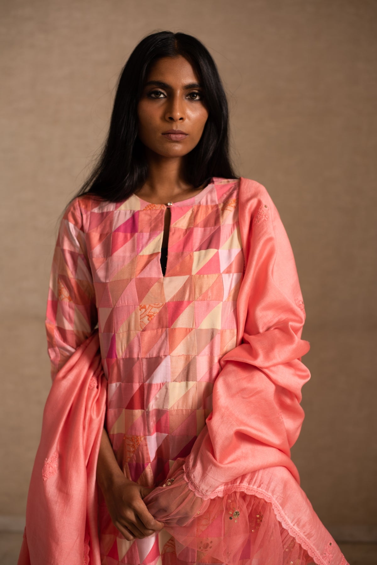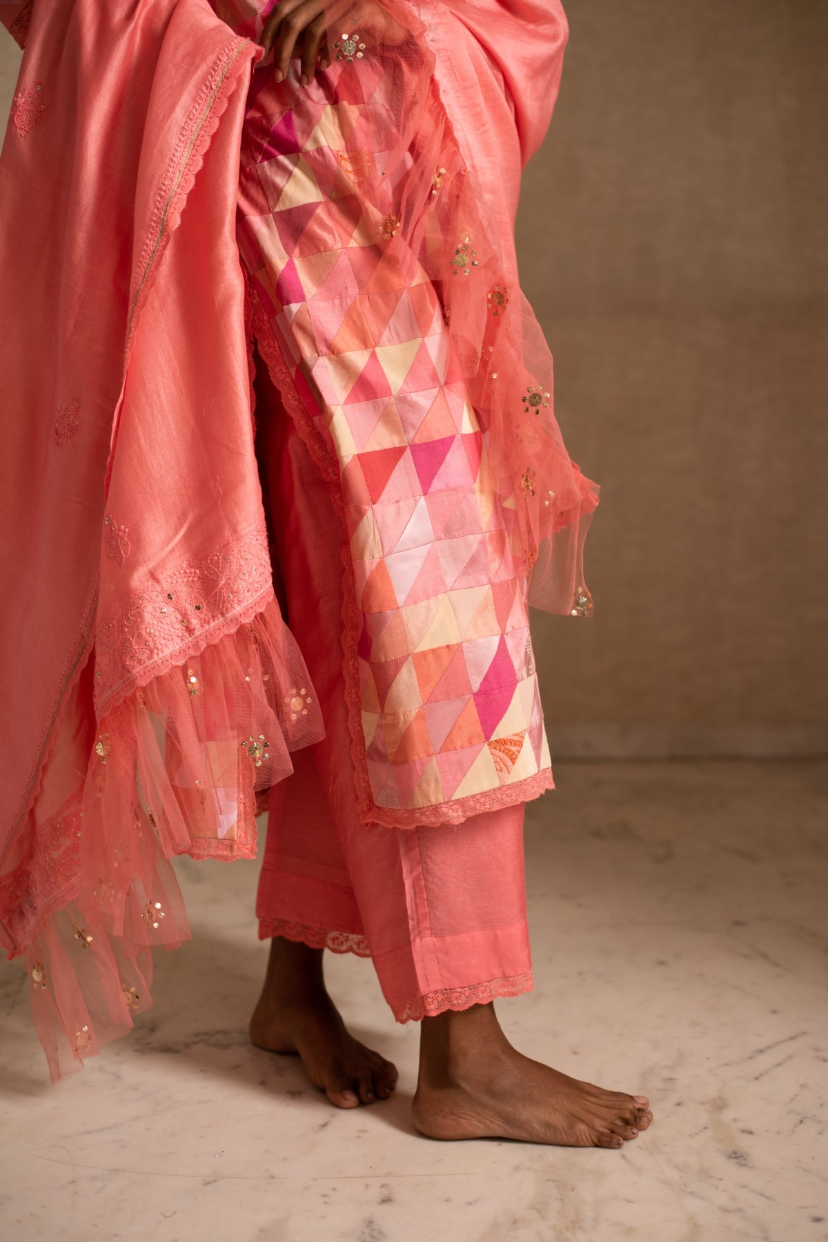 Upcycled patchwork kurta in shades of salmon pink made with remnants of heritage fabrics like silks, brocades, prints and handwoven tissues.The kurta is paired with a chikankari chanderi silk dupatta and palazzos.
