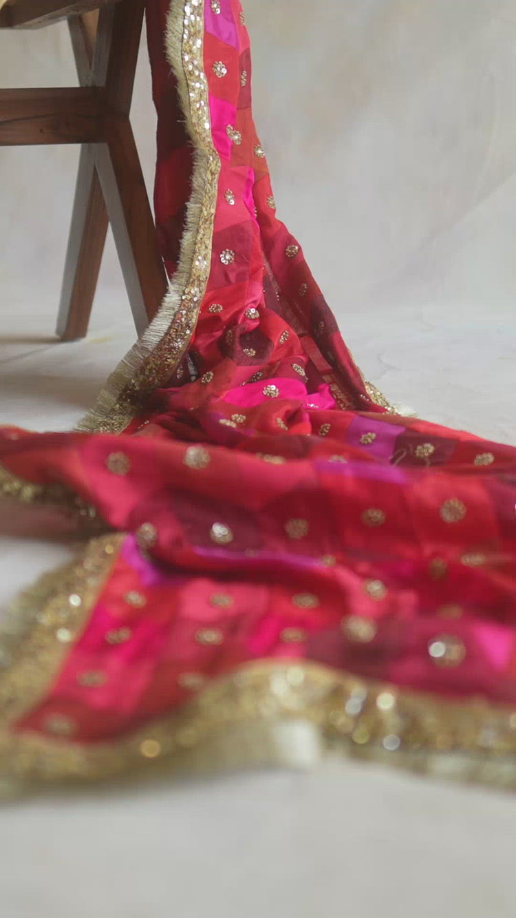 Upcycled patchwork dupatta made with remnants of heritage fabrics and embroideries like chikankari,brocades,satins, silks, prints and hand weaves in shades of pink,red and burgundy,Each unit is further hand embroidered with zardozi. The dupatta is bordered with handembroidered sequins and kiran
