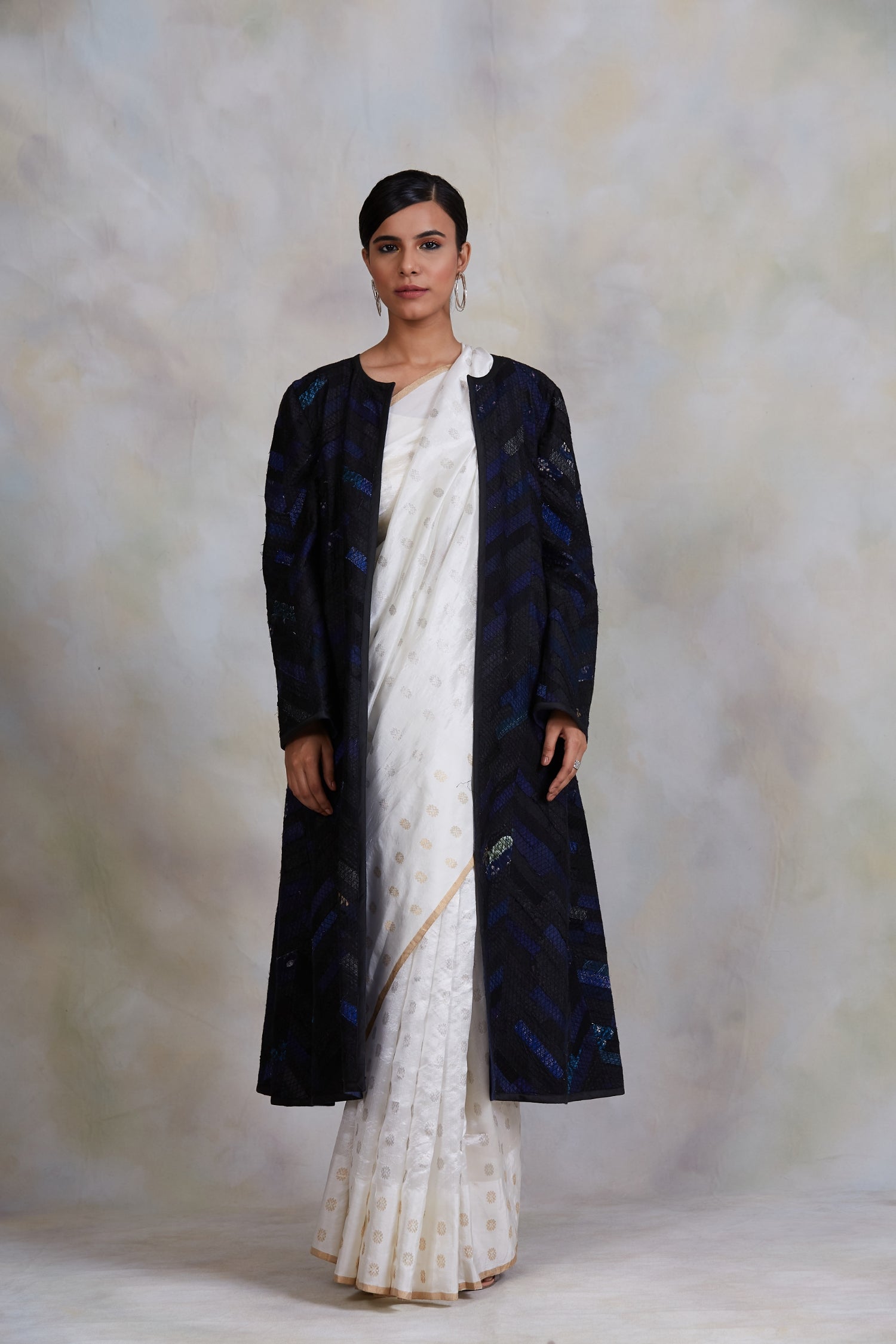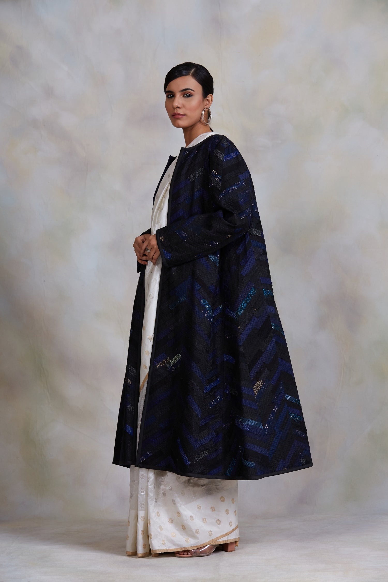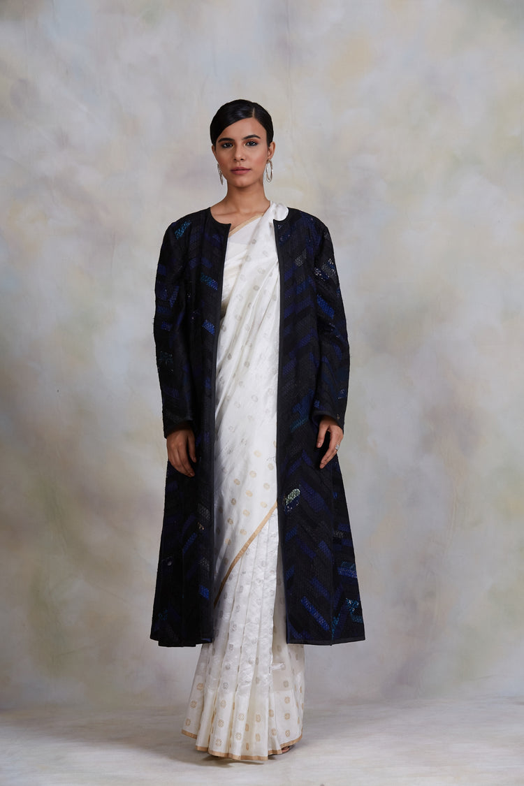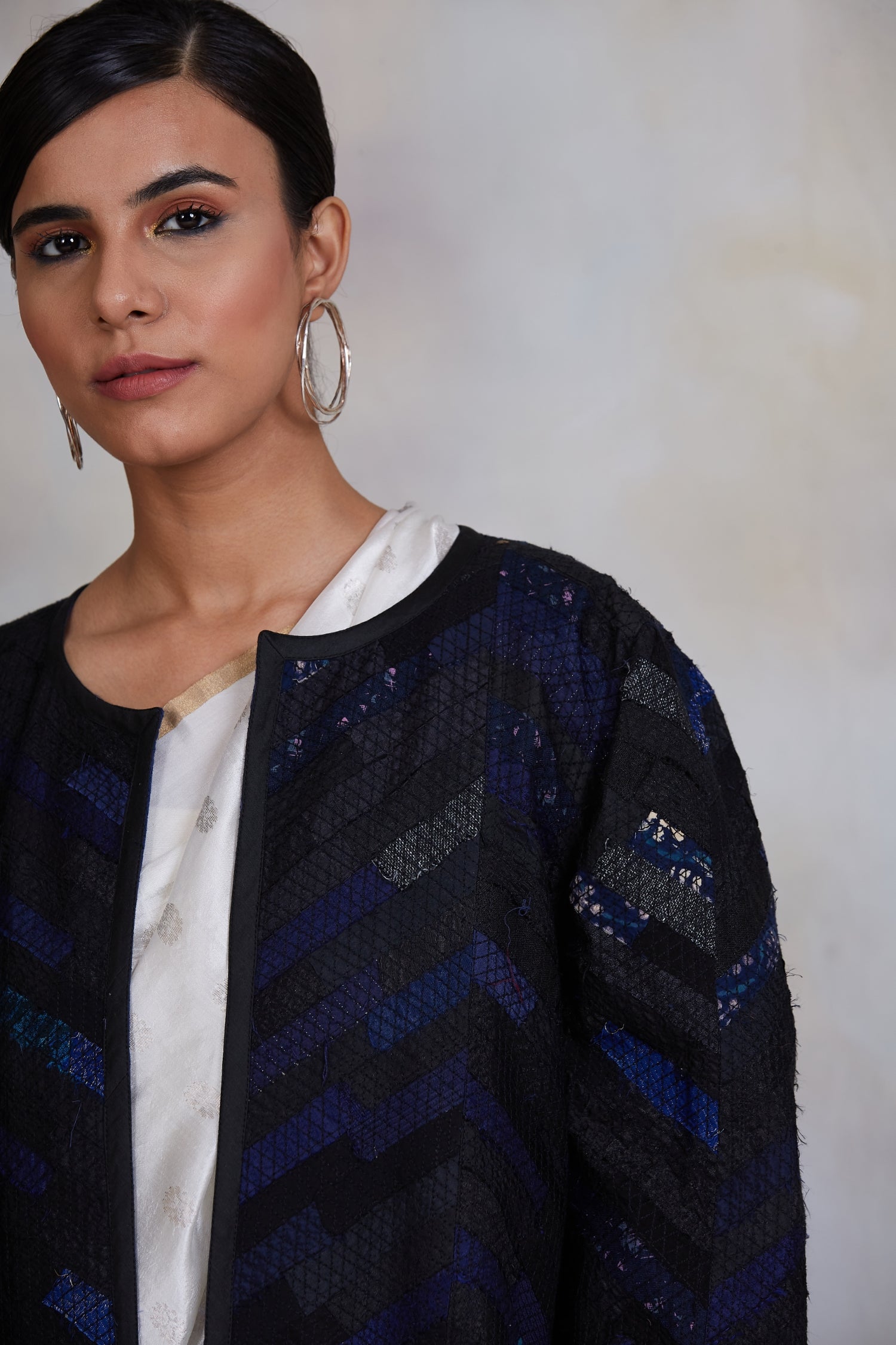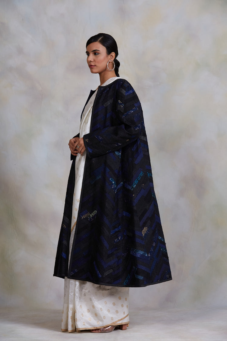 Upcycled patchwork jacket in shades of black and blue made with remnants of heritage fabrics like silks, brocades, handwoven tissues, prints and embroideries.