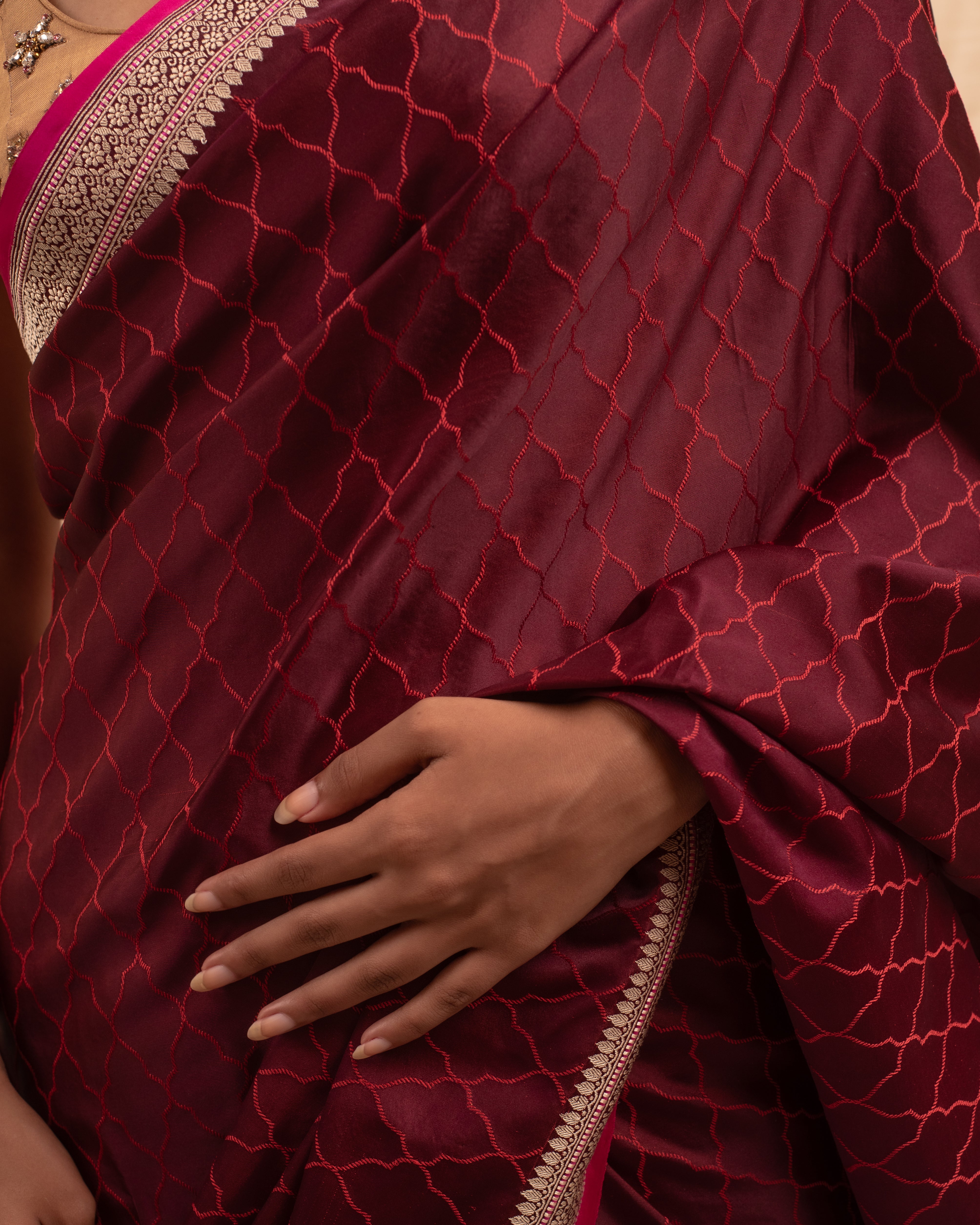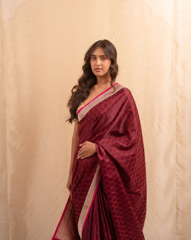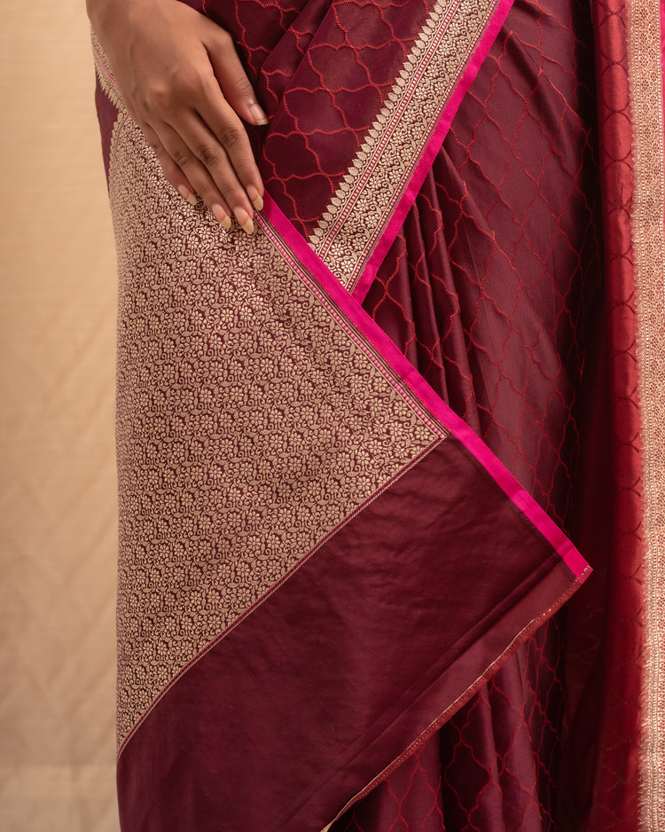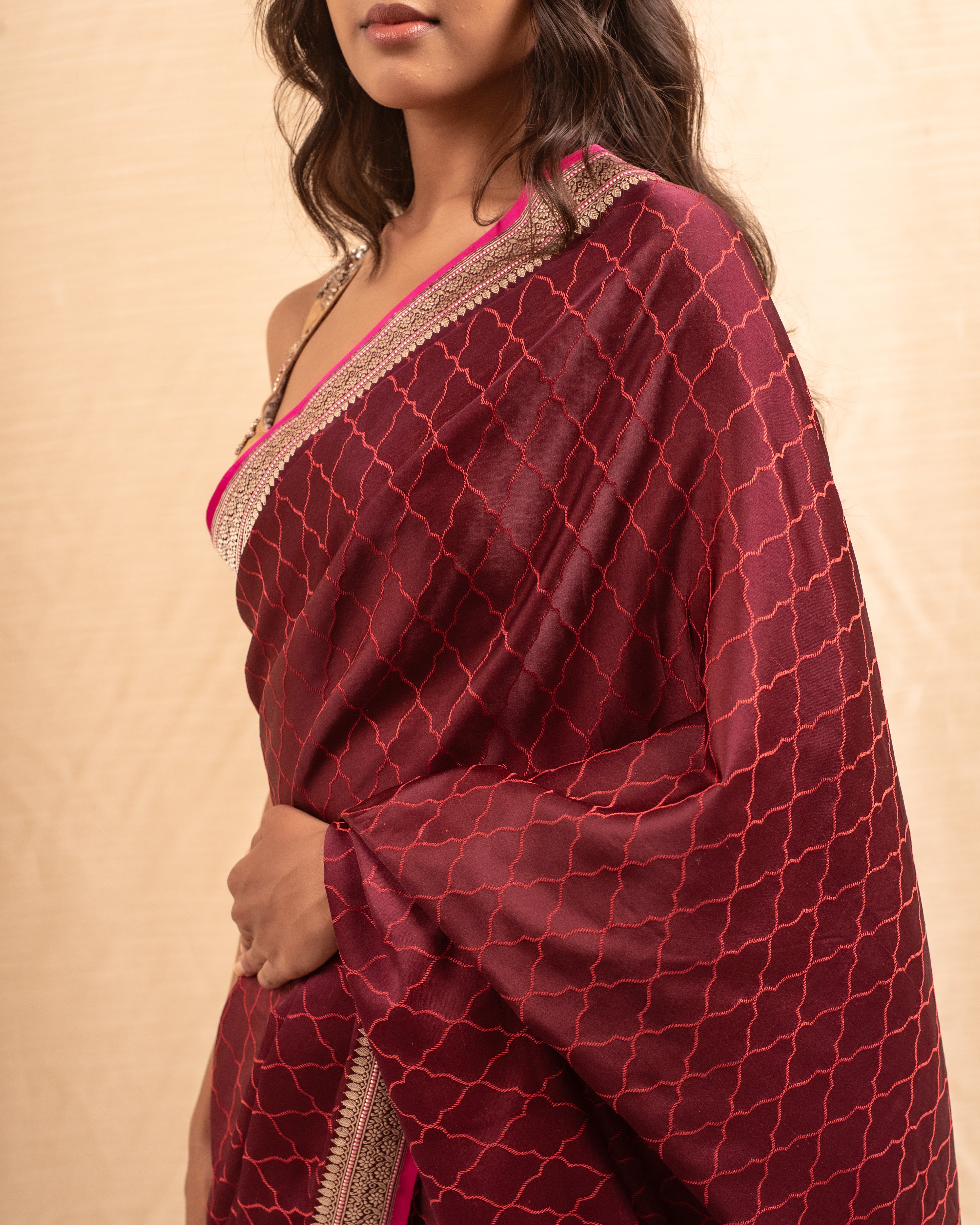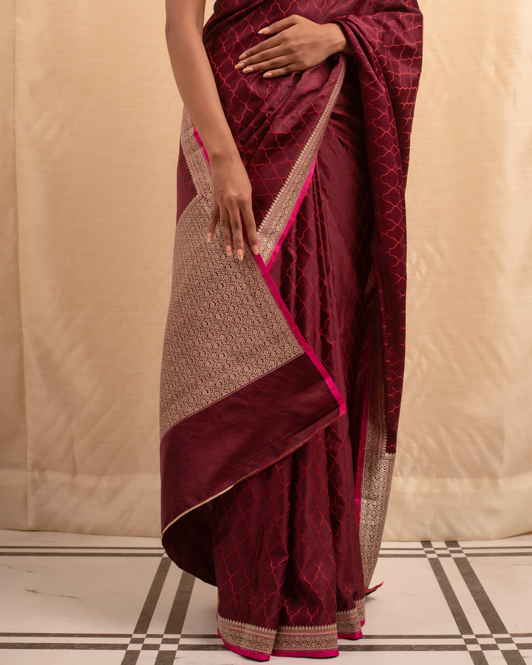 Burgundy silk brocade banarasi kadua saree with mughal jaali pattern with meenakari kadua border and palla