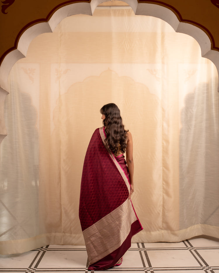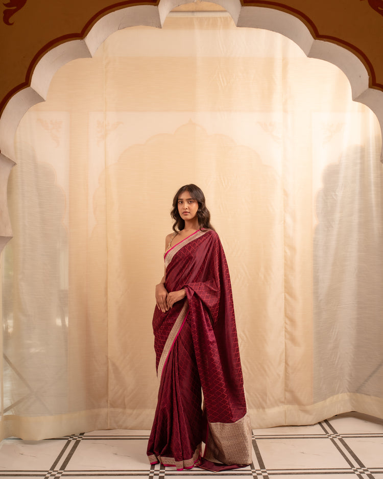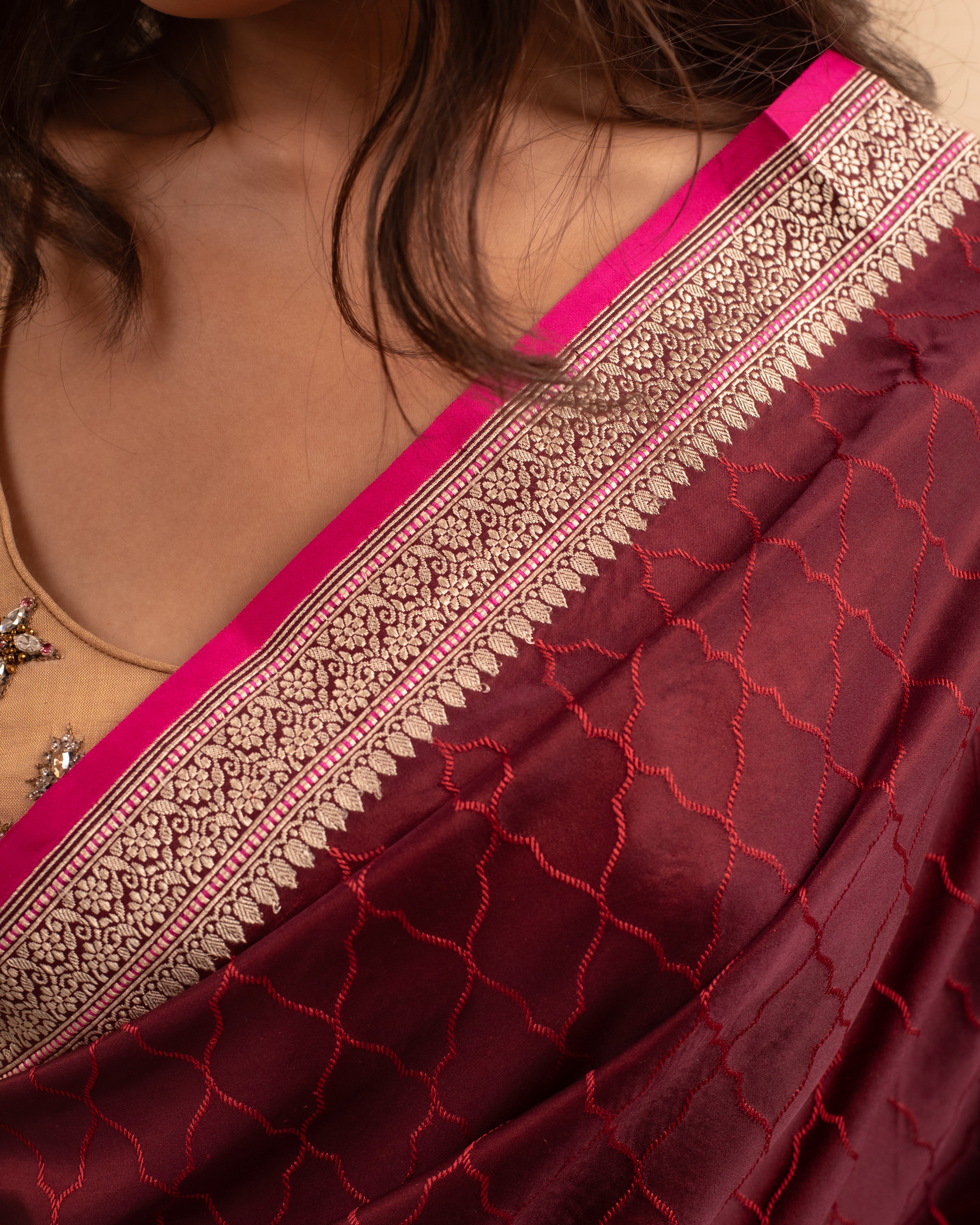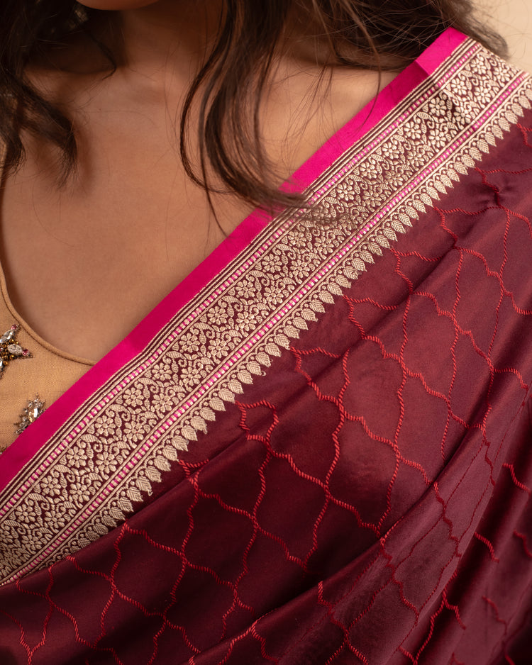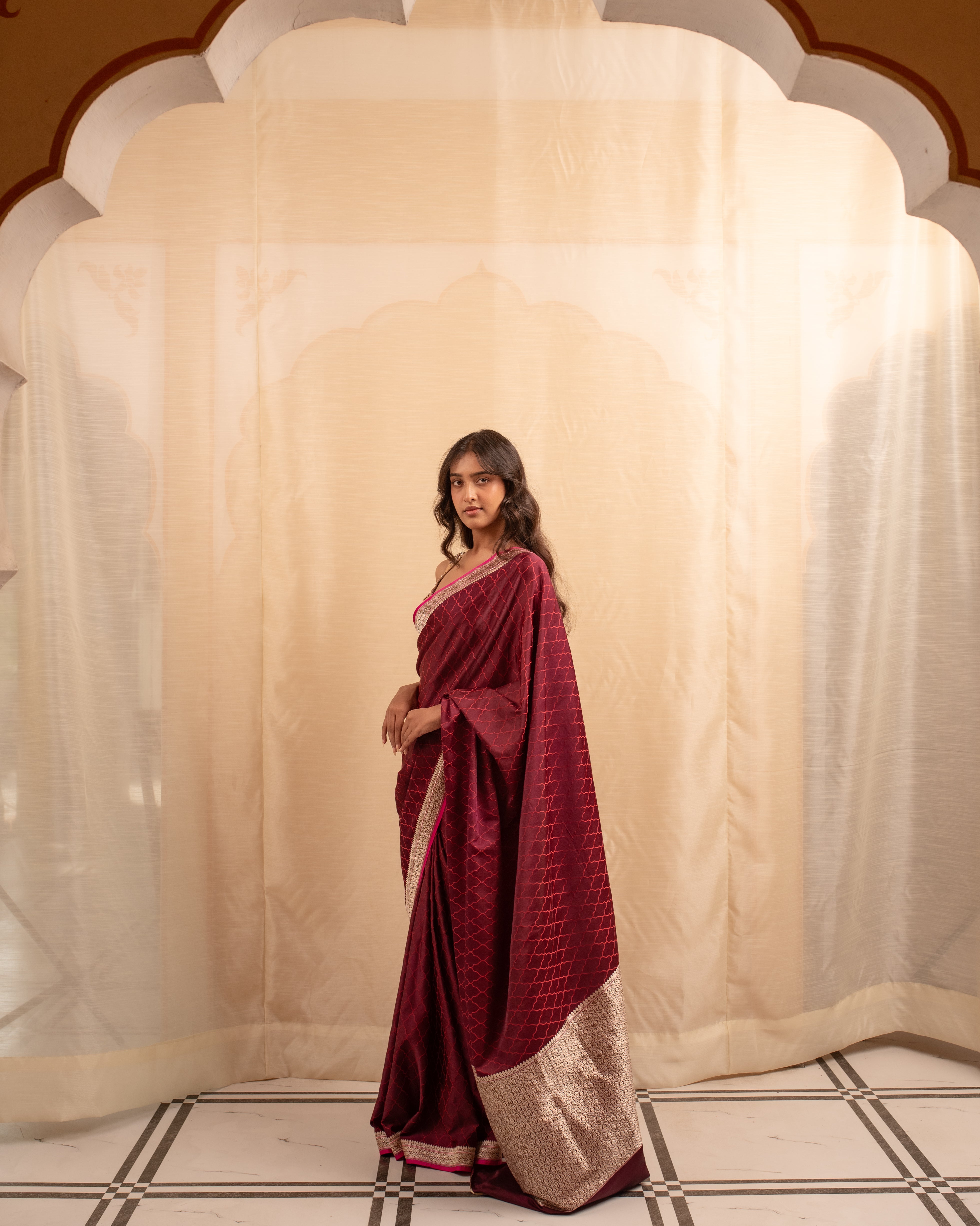 Burgundy silk brocade banarasi kadua saree with mughal jaali pattern with meenakari kadua border and palla