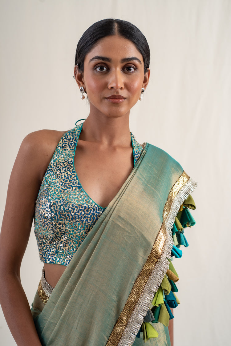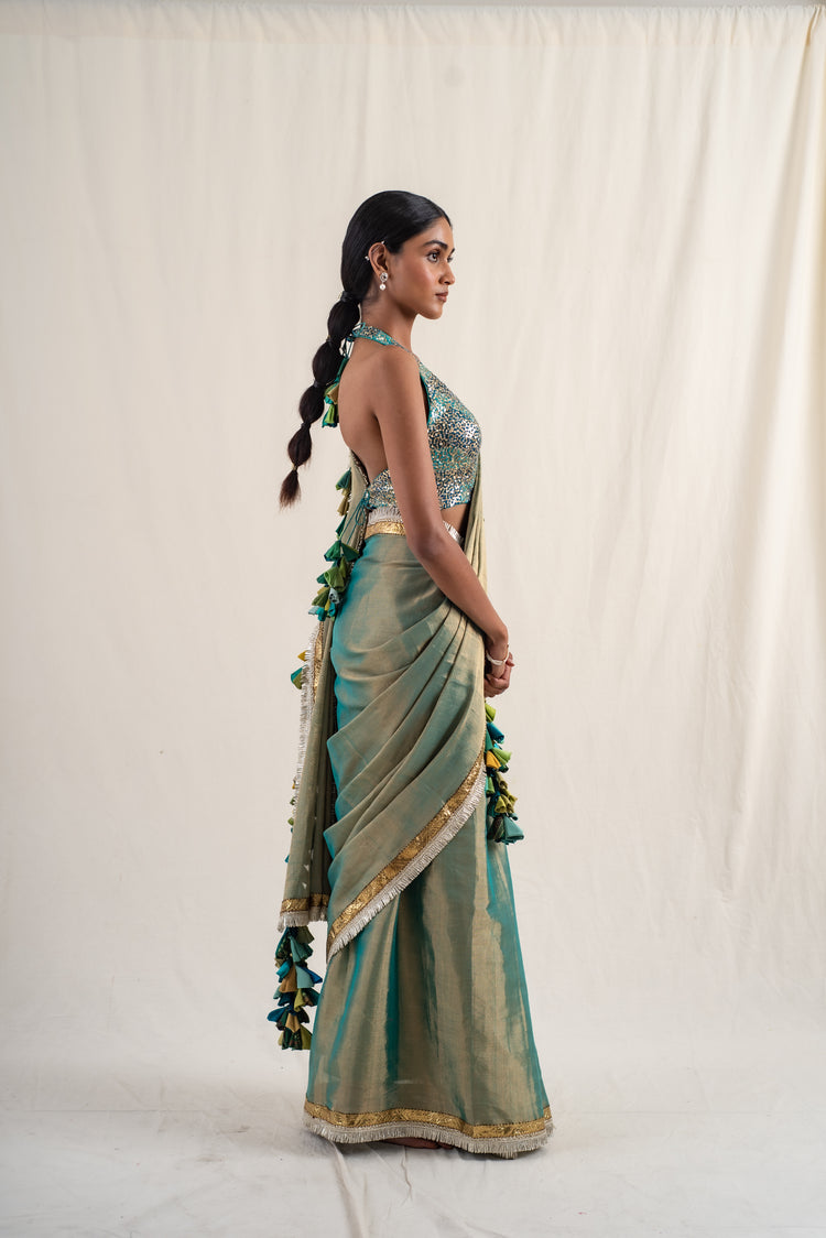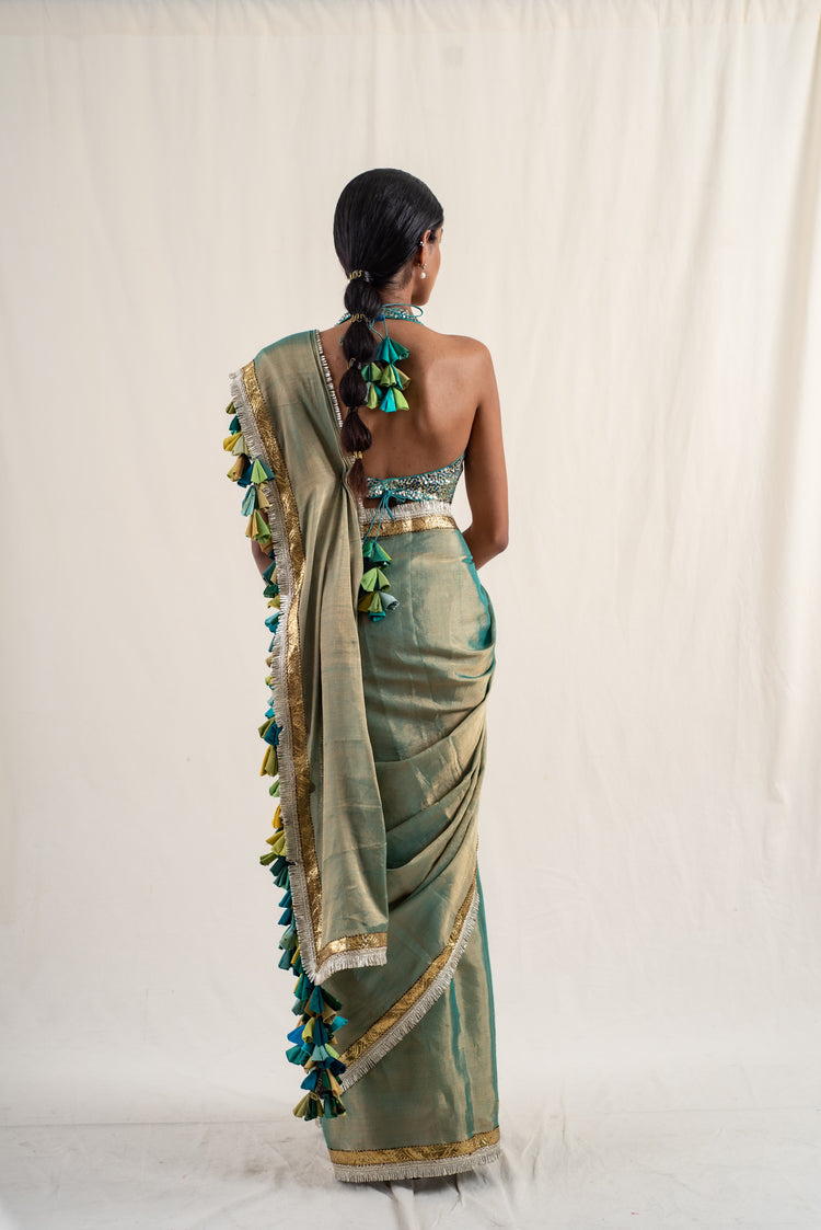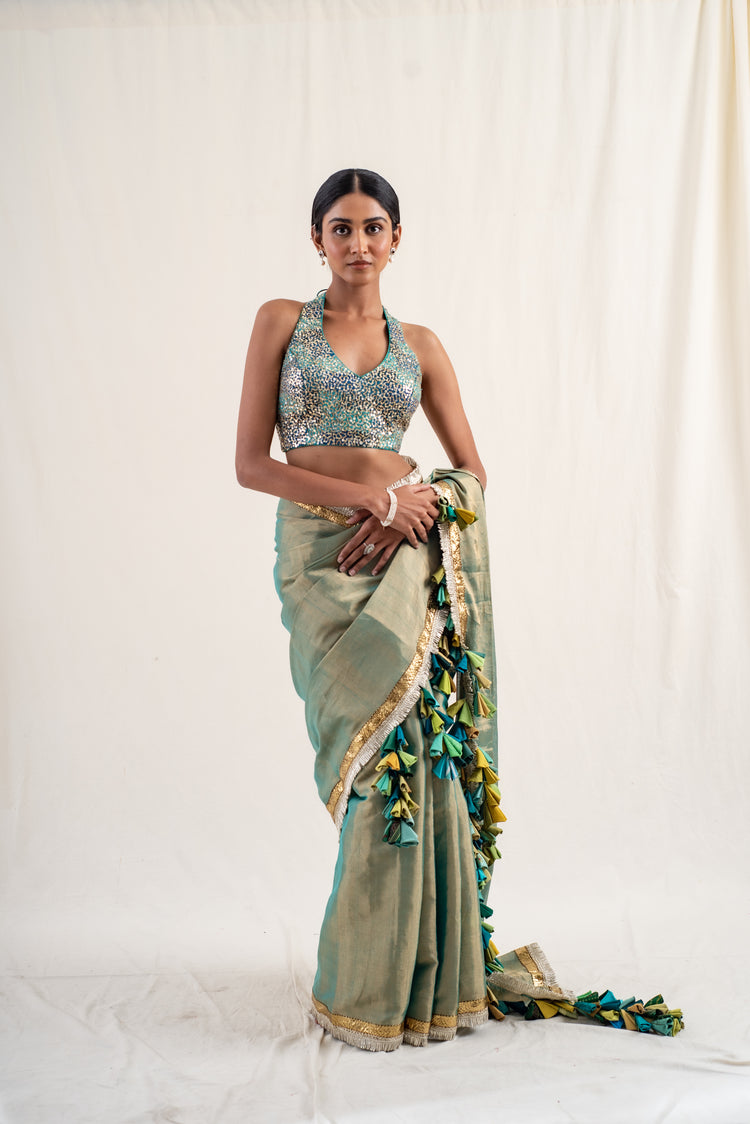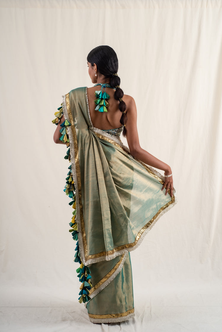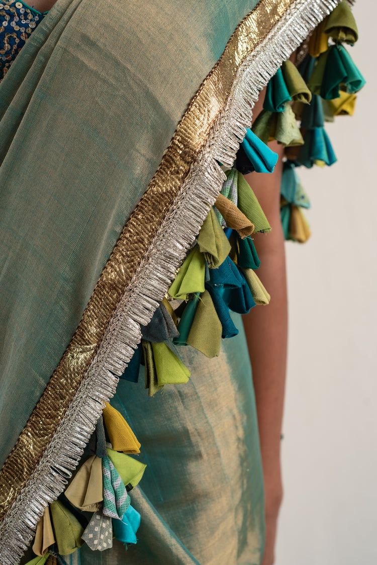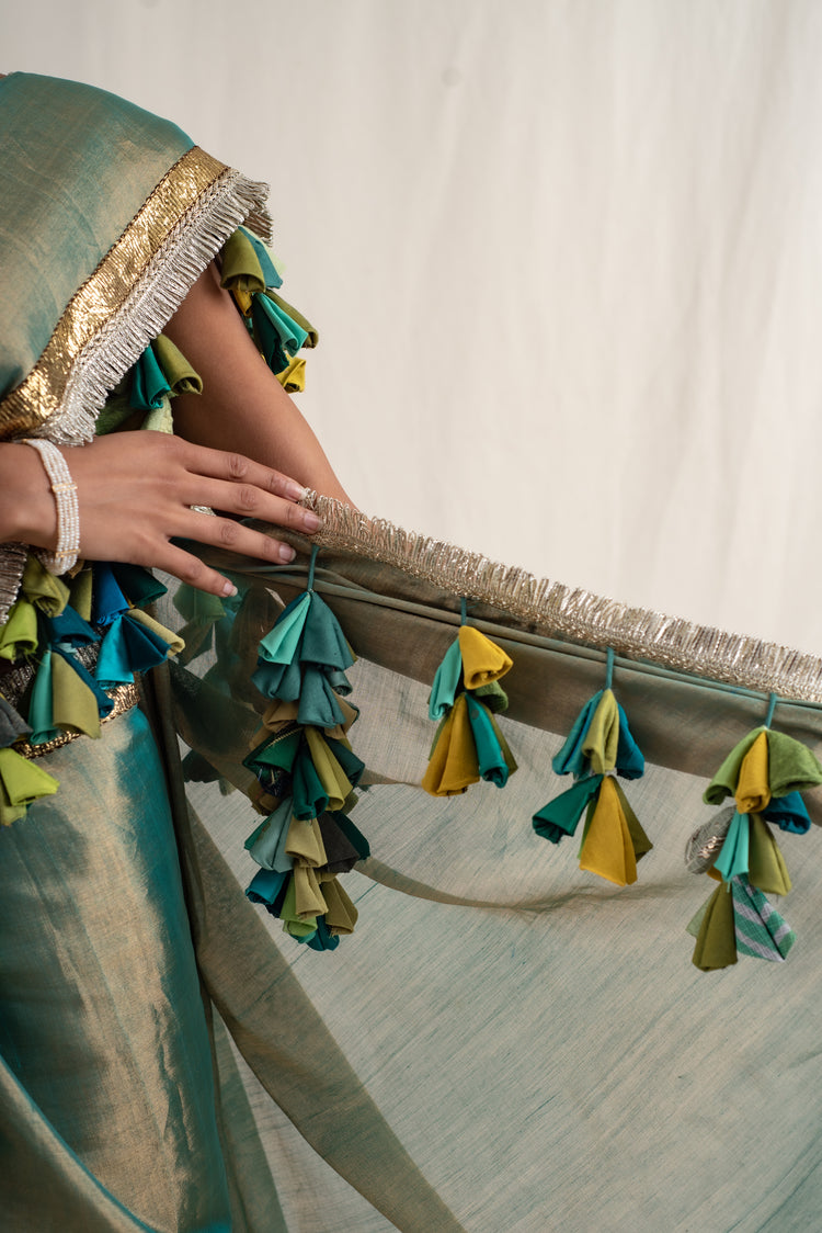 Green silk chanderi tissue saree with multicolour tassles, lampi and kiran lace on the palla