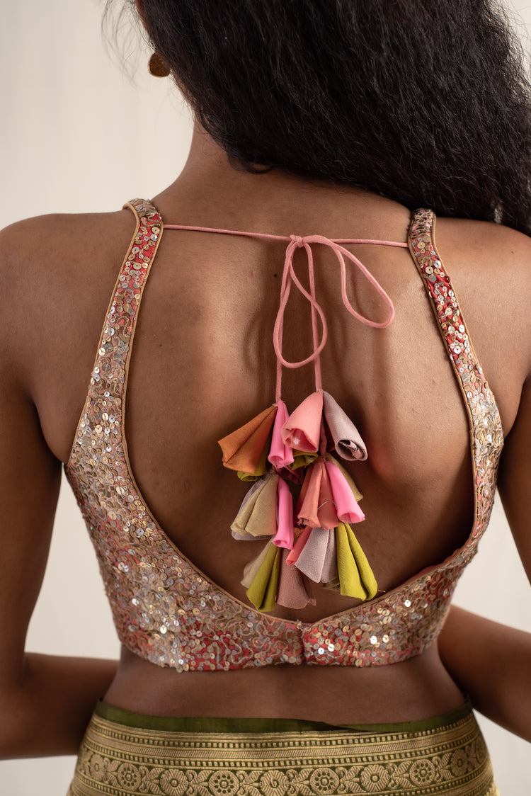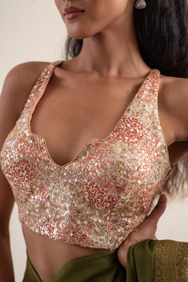 Upcycled blouse made with silk remnants in shades of peach fuzz with hand embroidered sequin clusters all over. The blouse is made with zero waste philosophy.