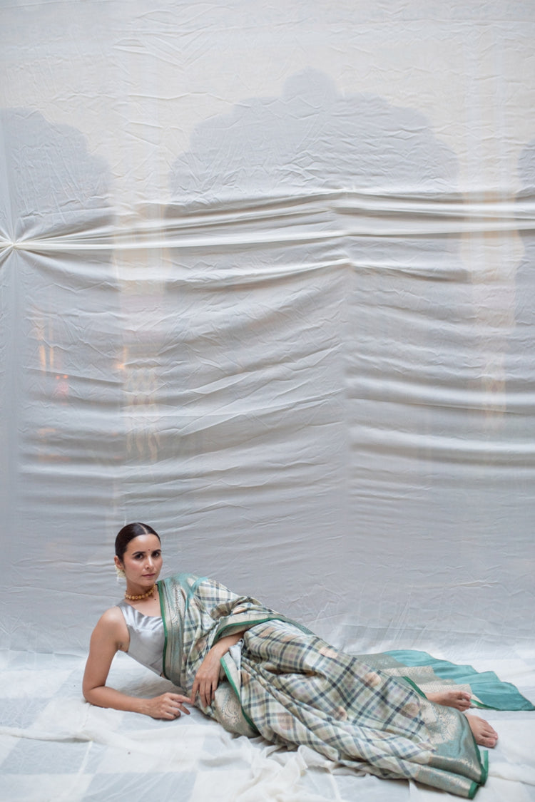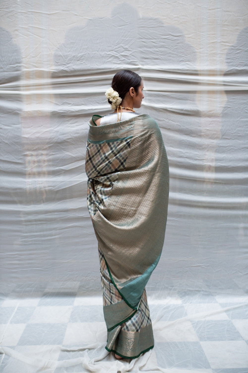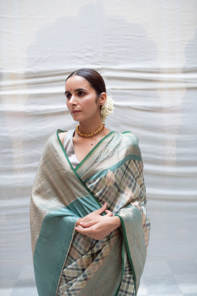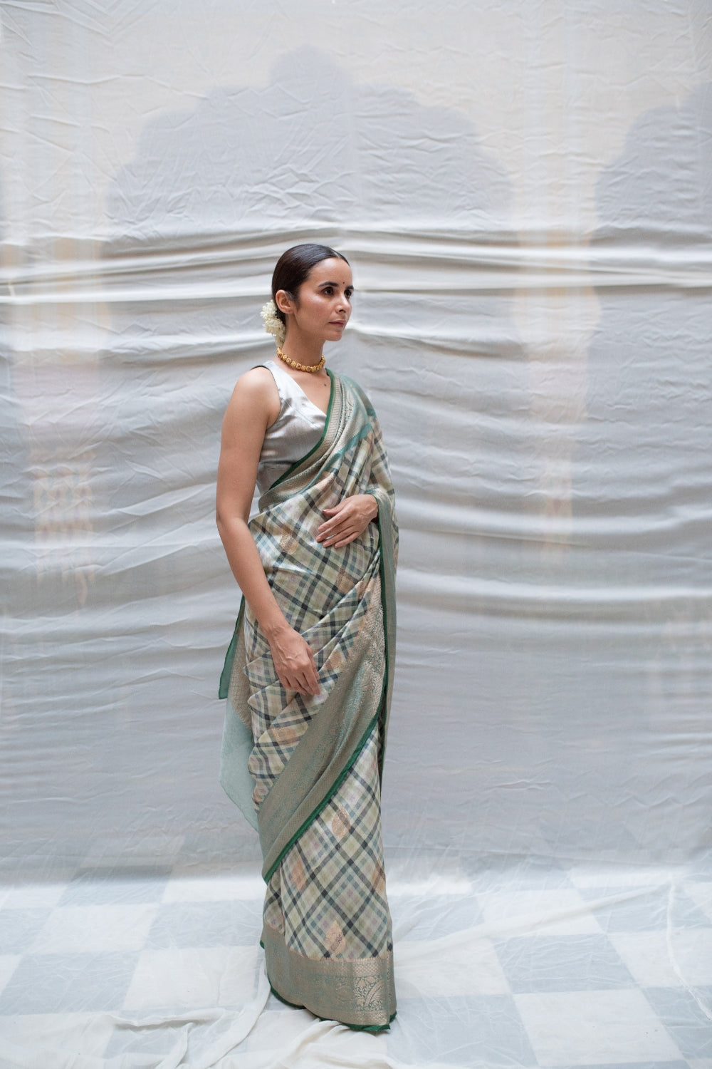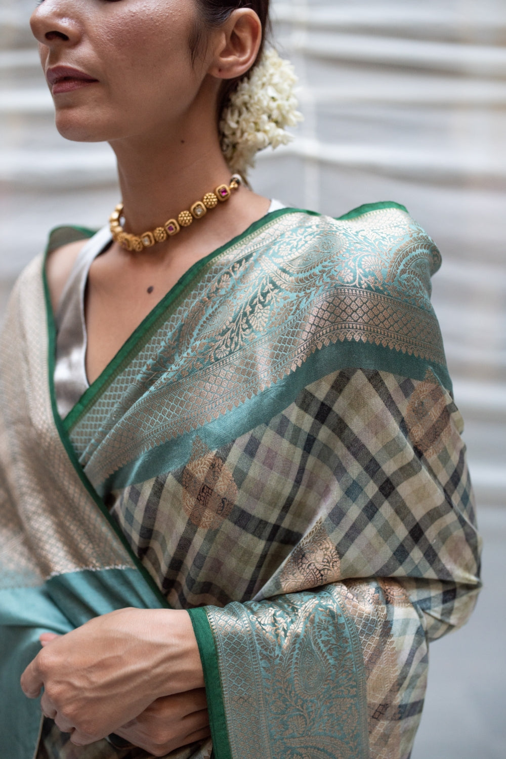 Green and ivory banarasi brocade saree with digital lines printed and highlighted with butis and border.