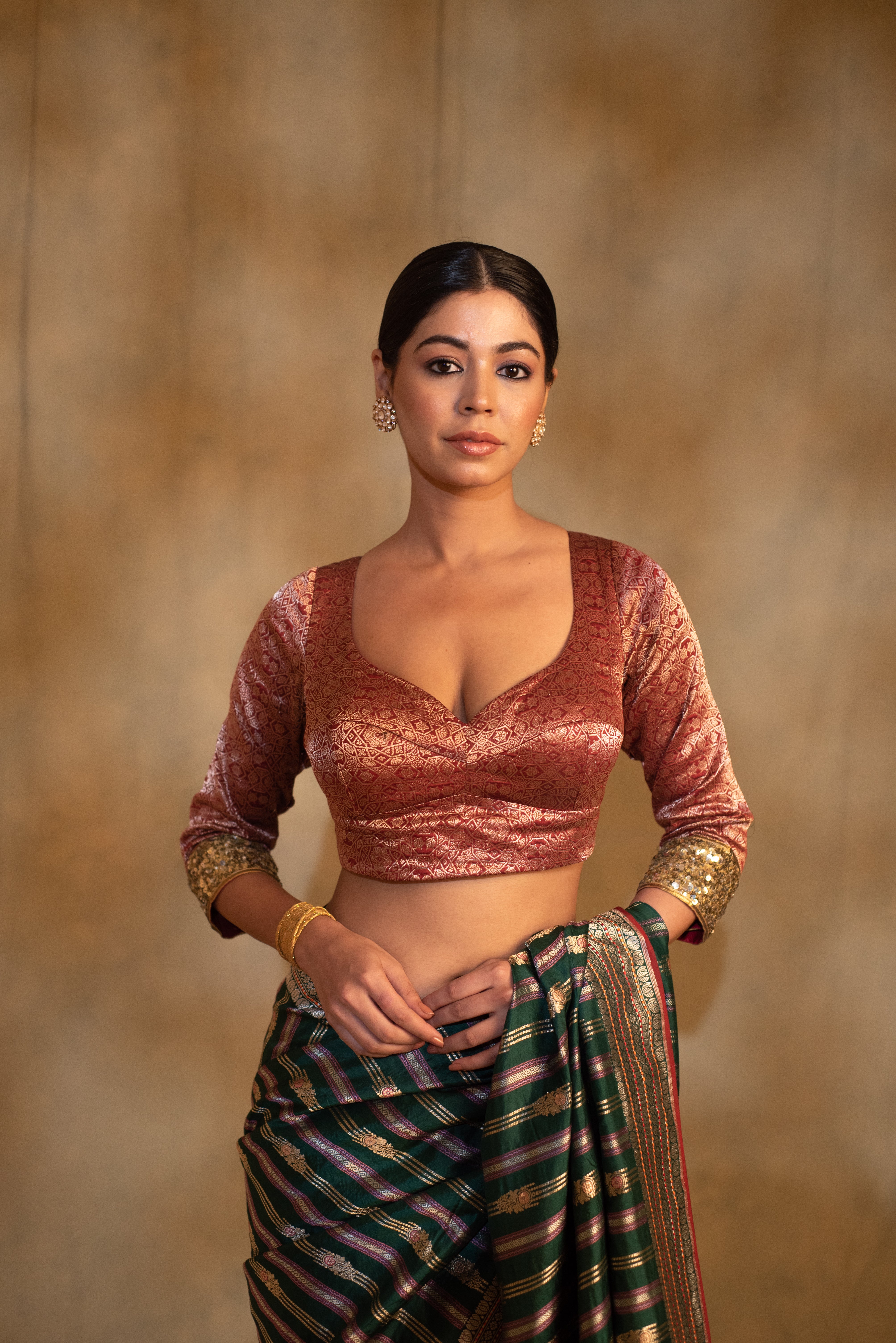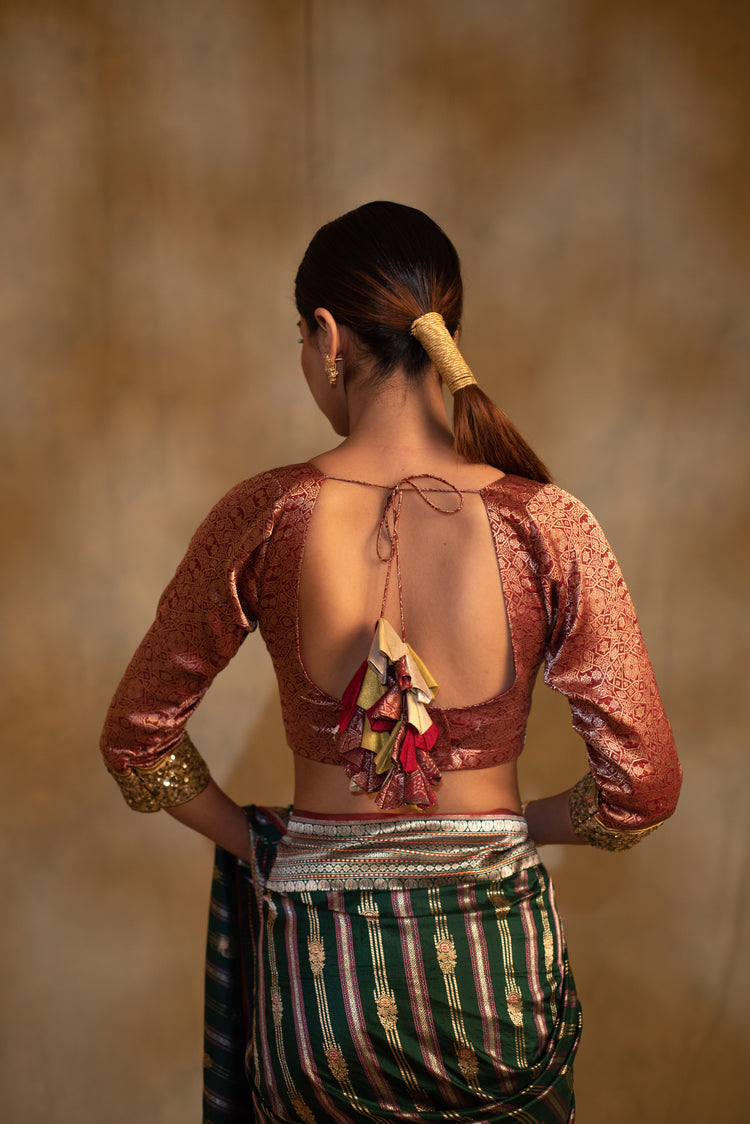 Red silk brocade blouse with hand embroidered sequin zardozi border and kiran highlights on sleeves.