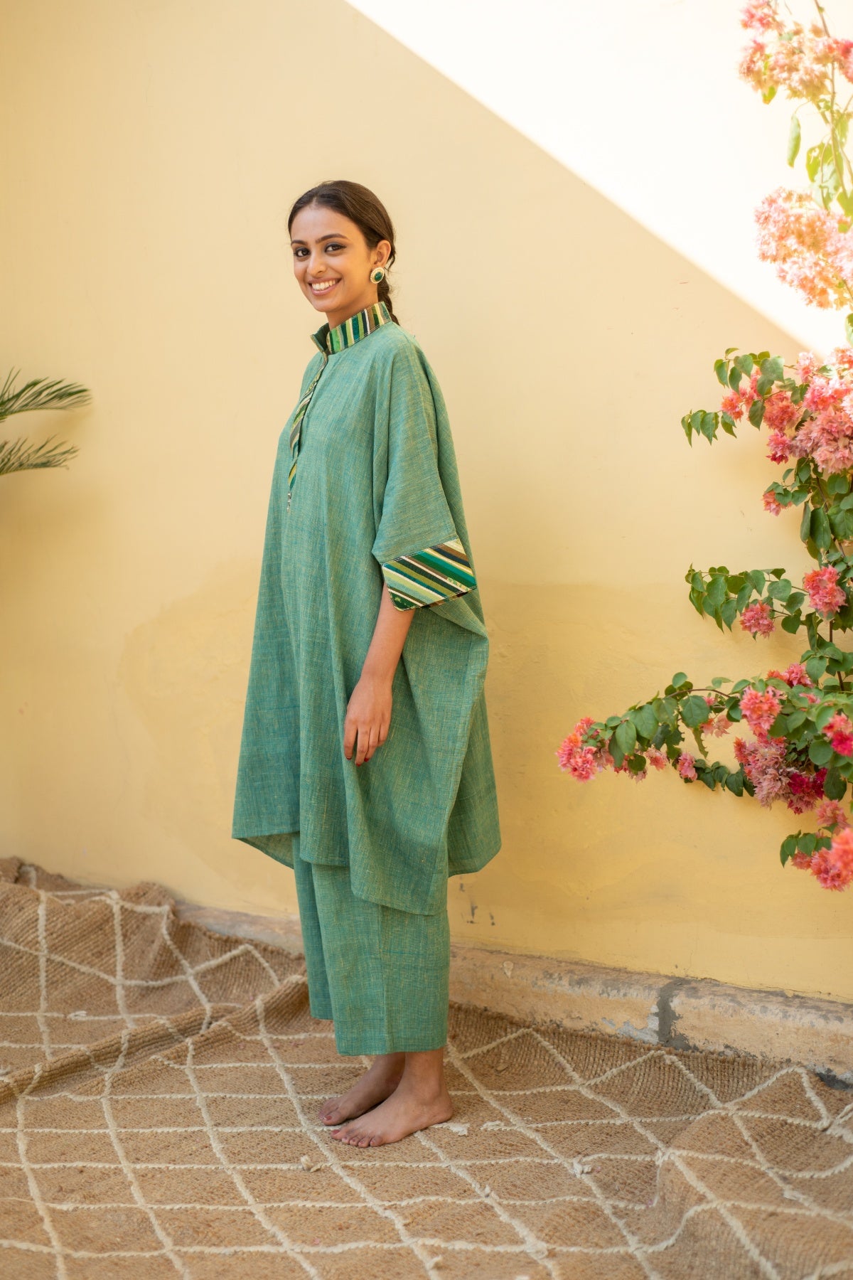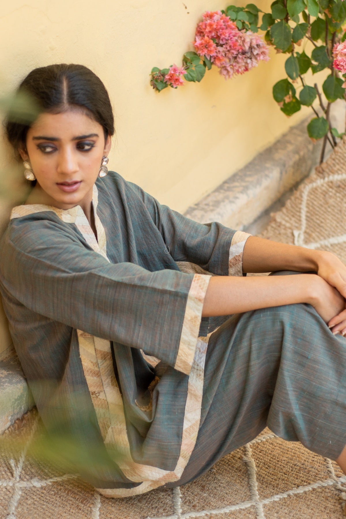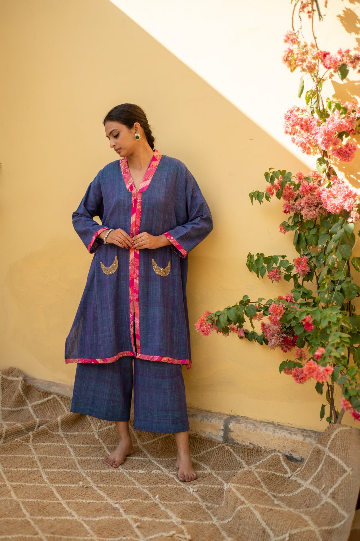 This collection features easy and breathable silhouettes of co-ords and kurta sets made from ethically crafted yarn dyed Kala Cotton and remnants of fabric. The theme of new beginnings and spirituality is reflected in the designs, which promote calmness and inner peace. Each piece is designed with care and attention to detail, meeting high standards of sustainability and ethical production. The collection offers a beautiful blend of style and sustainability, perfect for conscious consumers who care about fashion and the planet.