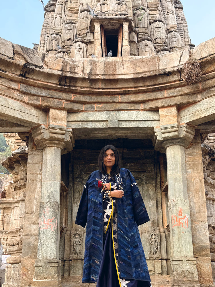 Upcycled patchwork jacket in shades of Blue, made with remnants of heritage textiles such as chikankari, brocades, satin, silk, printed fabrics, and handwoven weaves. It is further adorned with handcrafted laakh tukdis (hangings), stones, and intricate metallic embellishments.