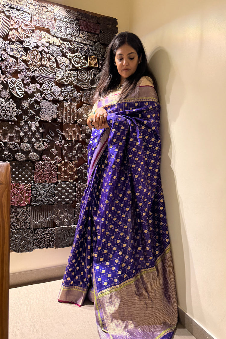Blue Silk Chanderi Saree, Kanjivaram-inspired, featuring an all-over geometric pattern with floral paisley butis and a gold palla.
