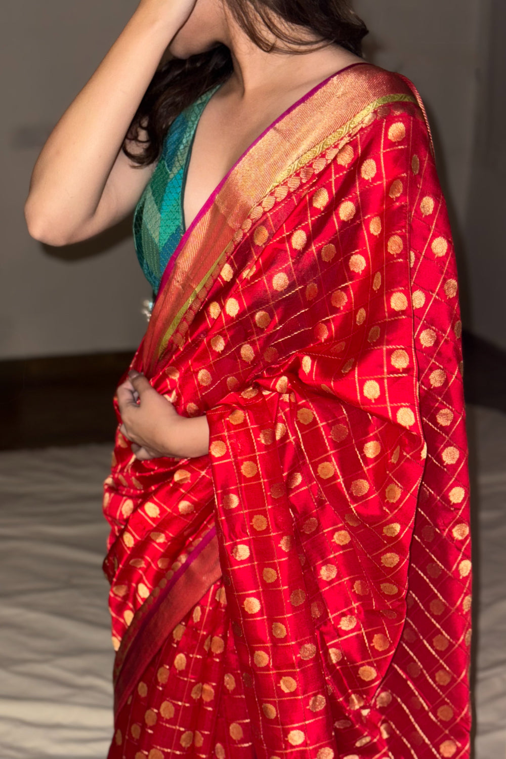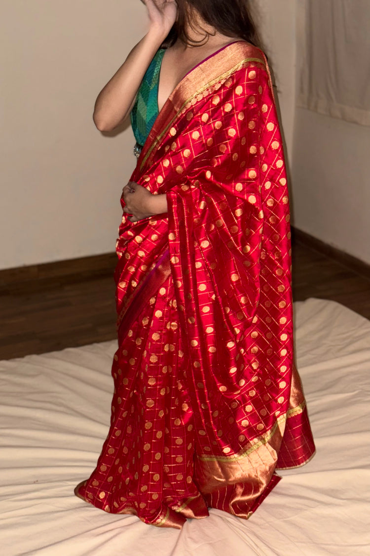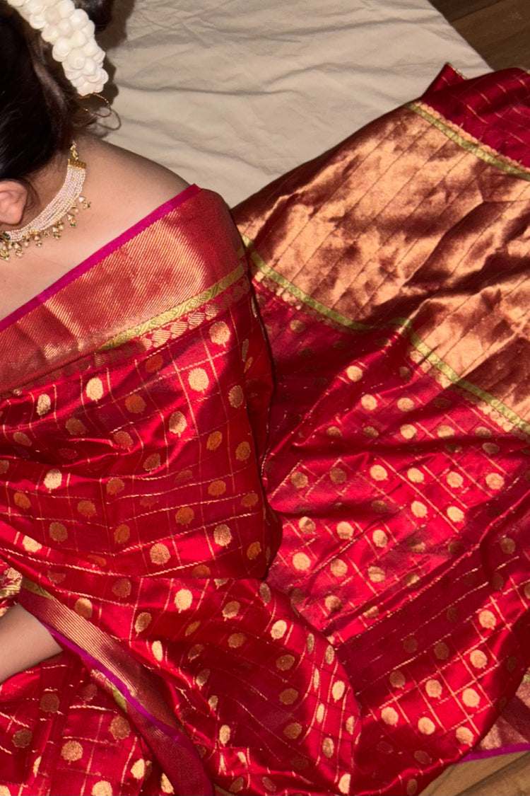 Red Silk Chanderi Saree, Kanjivaram-inspired, featuring an all-over geometric pattern with floral paisley butis and a gold palla.