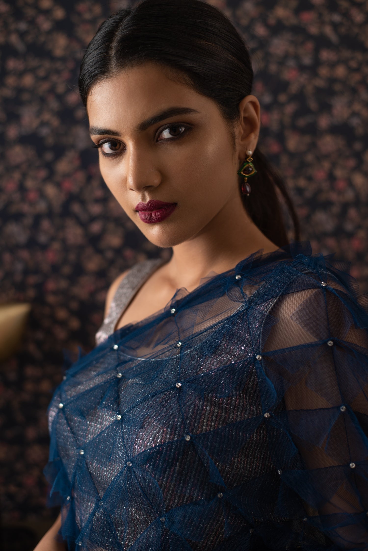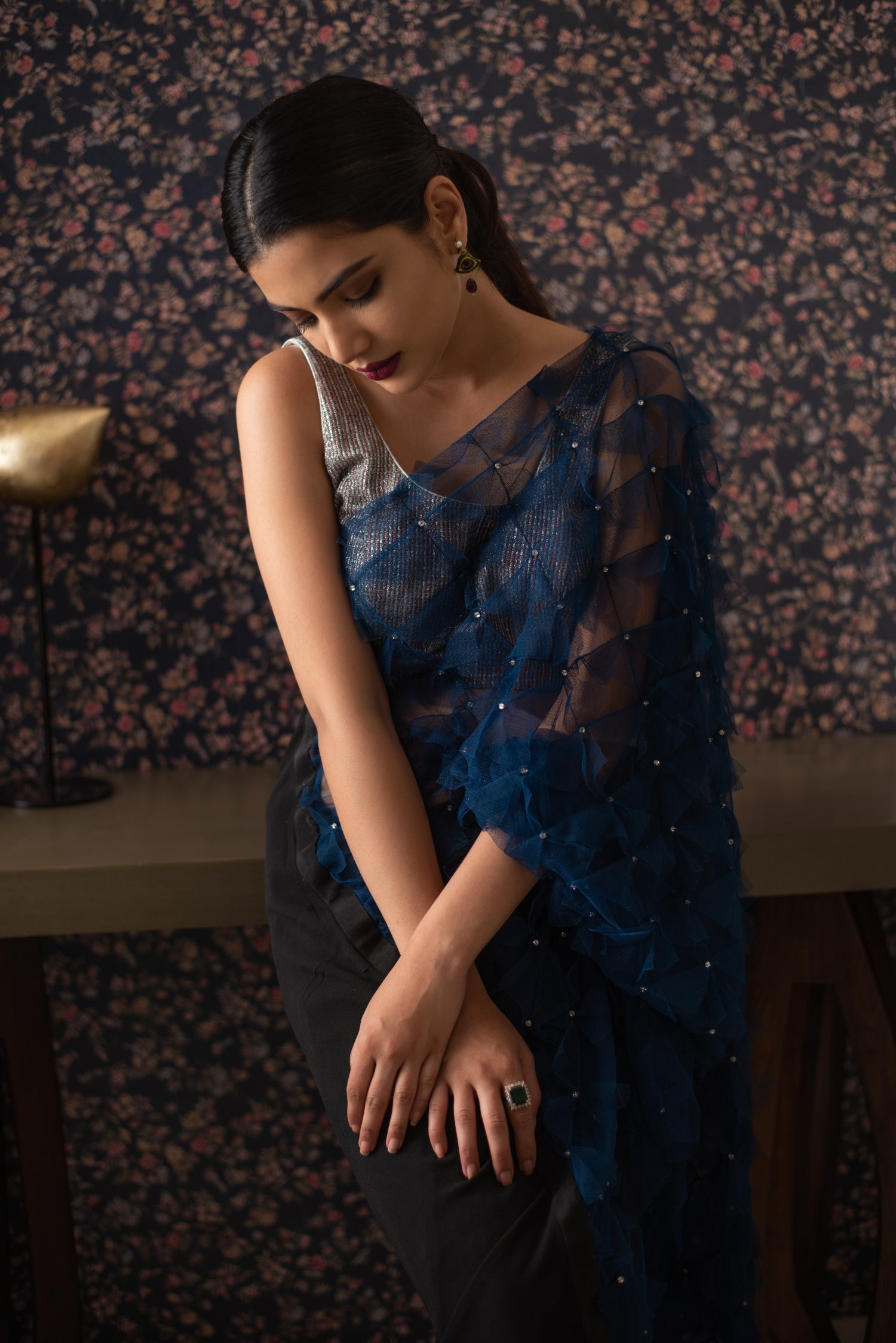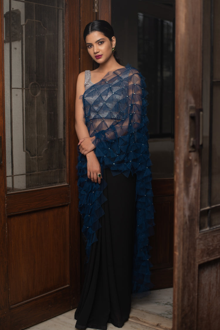 Midnight blue & black tulle jod concept sari with sequins and swarovski