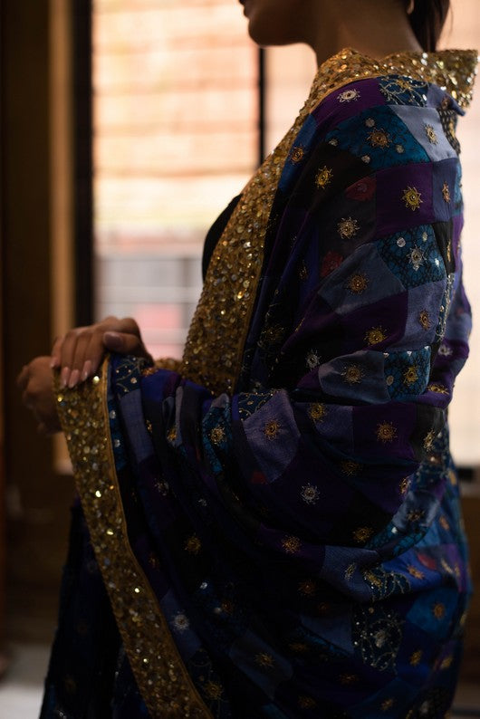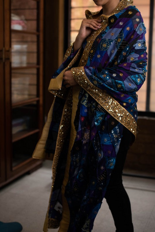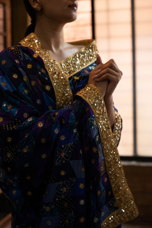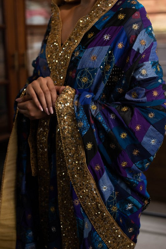 Upcycled patchwork dupatta made with the remnants of heritage fabrics and embroideries like chikankari, brocades, satins, silks, prints and hand weaves in shades of blue .Each unit is further hand embroidered with zardozi butis. The dupatta is embellished with hand embroidered sequinned border.